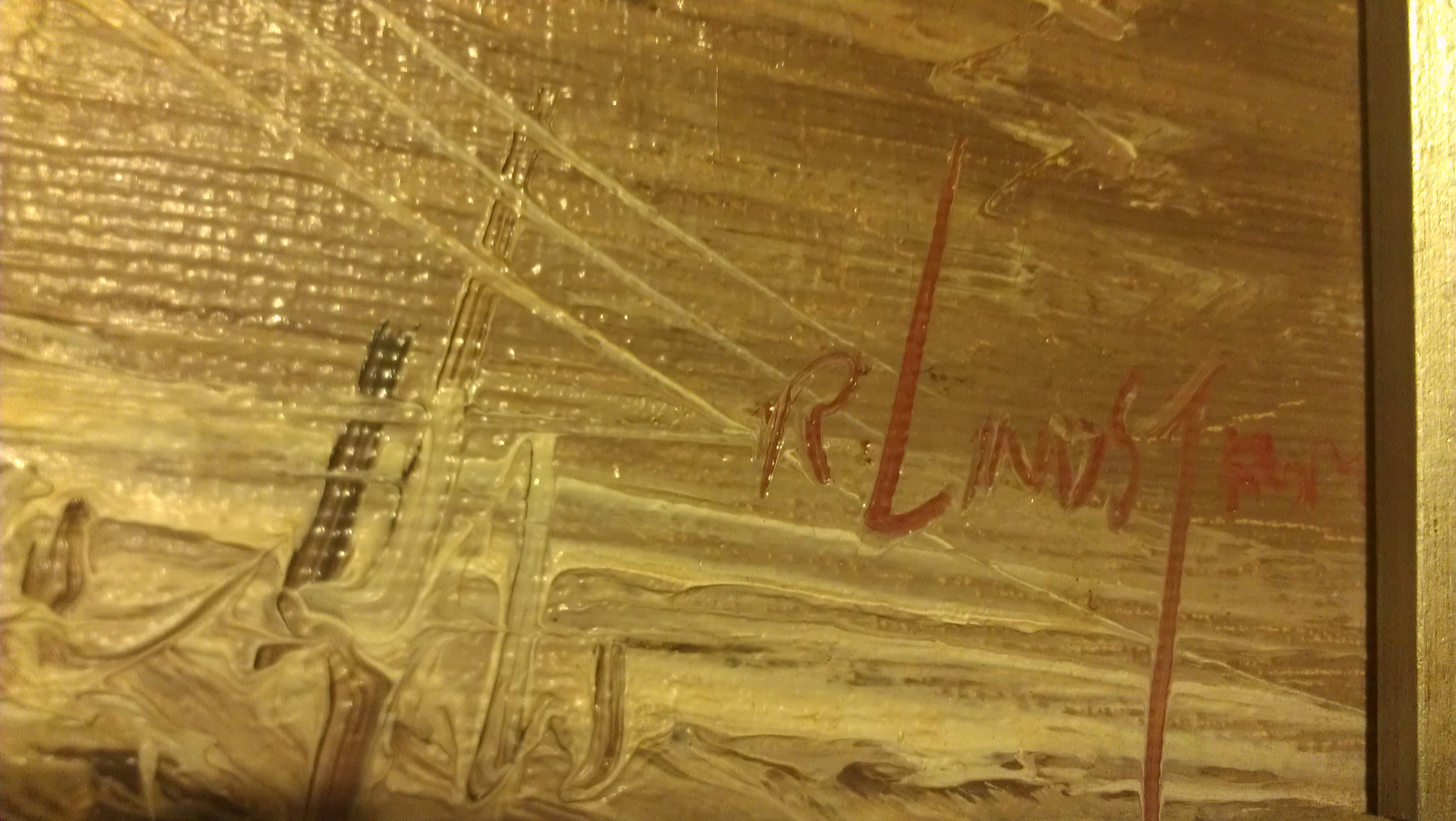 Distinguishing marks signed, del red, lower right corner R.Lindstrom. Back of canvas is mrkd.w #"knollwood" 5 ( circled), #11-029-2. Frame has stamp and M65 F218, in pencil 218 & 26 inner frame has 8x10 stamped on it.
