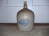 clay jug, grayish in color, with black drippings on it. There is a number 3 between two of the drippings. The name of the distillery and location is printed on the front. It has a clay handle on the top of the jug.