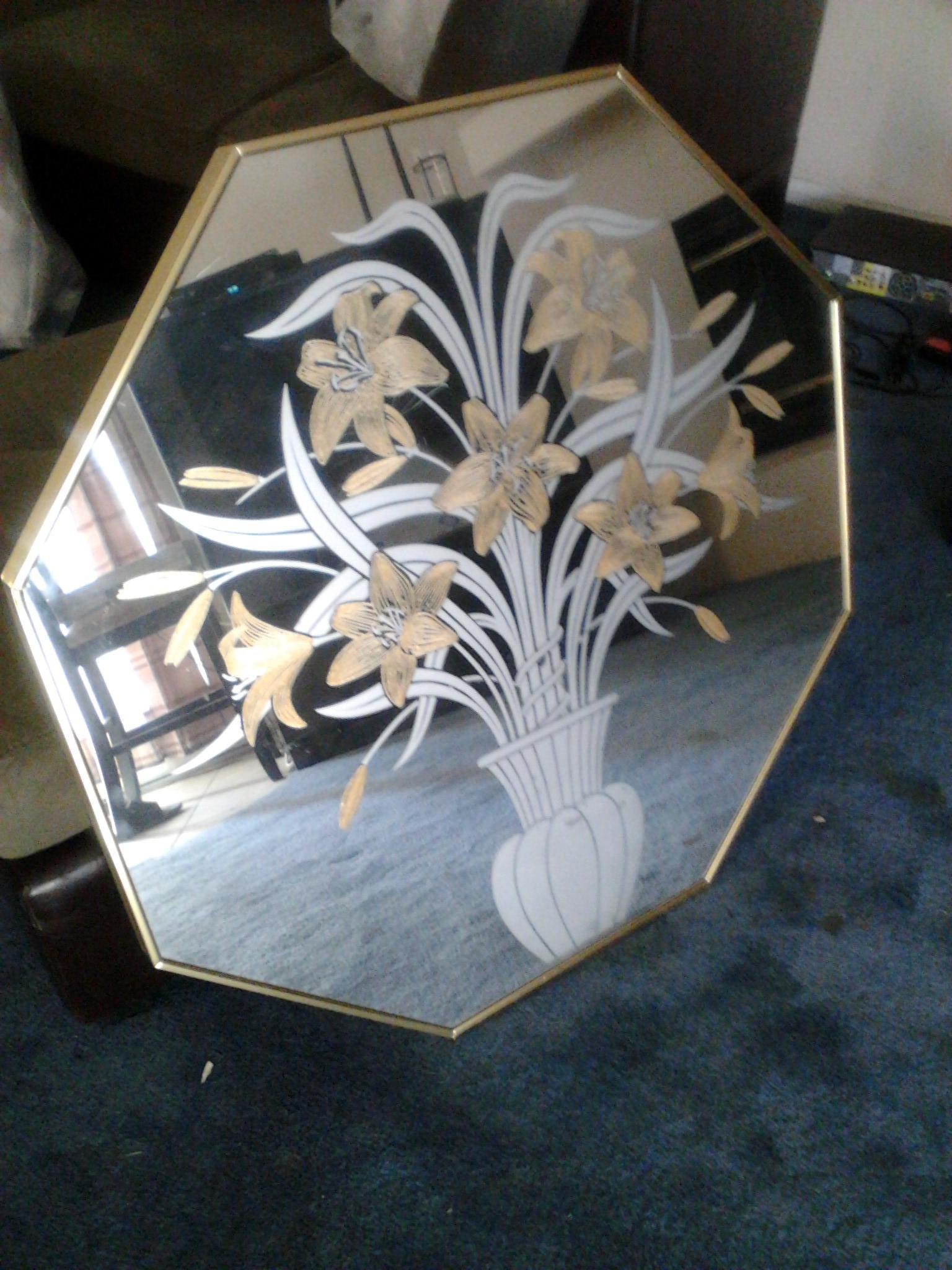 Robert Slimbach Windsor 36×36 Octagon Shape Wall Mirror Etched Tiger Lily Bouquet. On the back it's stamped 3317.