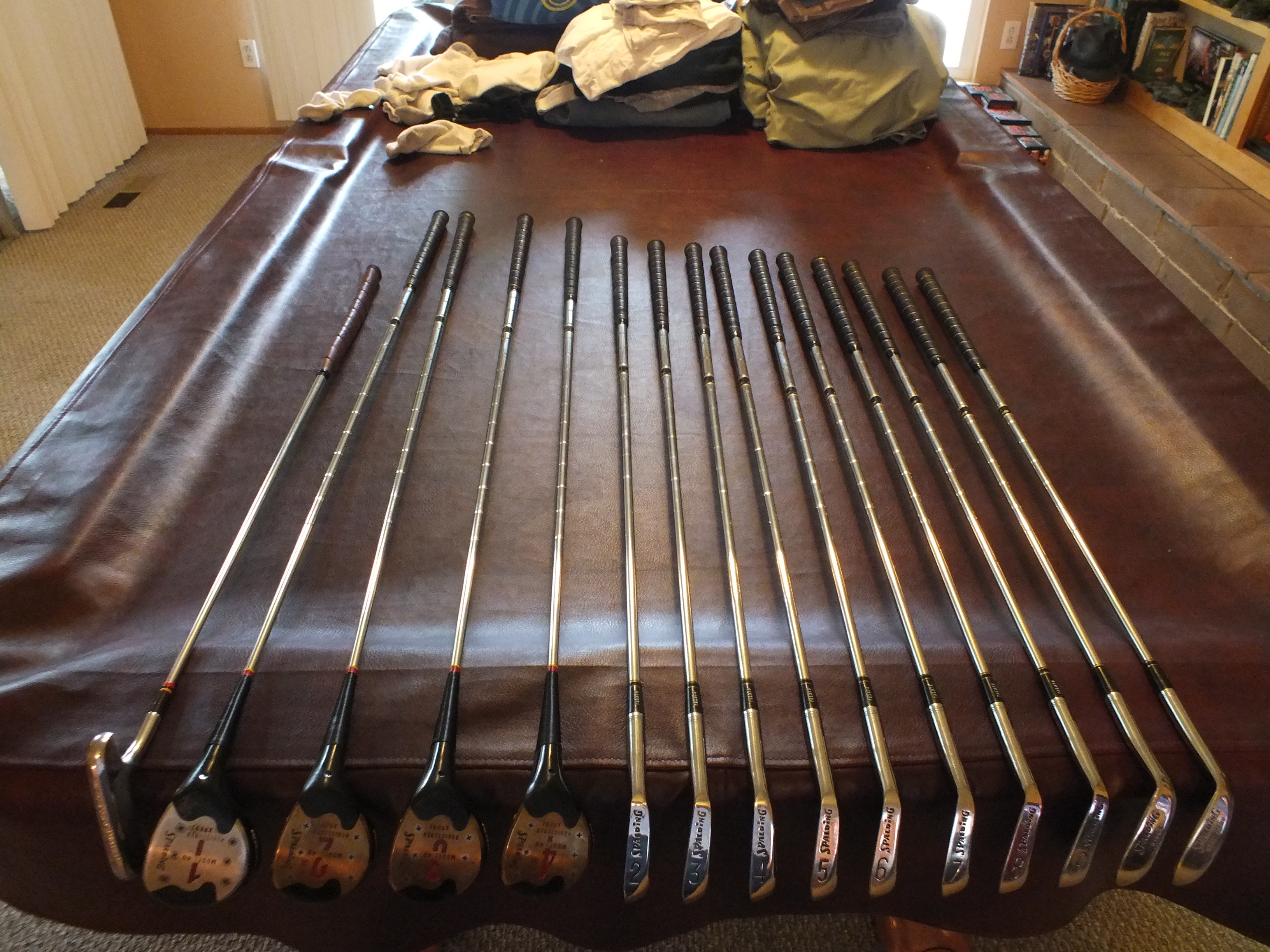 Set of 15 clubs includes 8 Synco Stoke Irons (2-9) with pitching wedge and sand wedge as well as 4 Robt T. Jones, Jr Model 49 Woods (1, 2 1/2, 3 1/2 and 4 1/2)