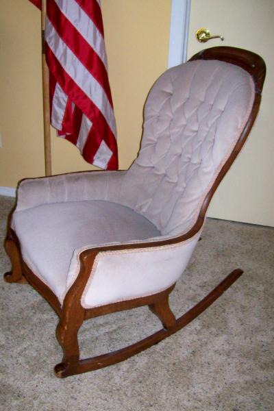 Unusual rocking chair with very low arms. Inherited about 26 years ago. It was in very bad condition and I completely refurbished it with new webbing, re-tyed springs, new stuffing and cushion, new high-quality upholstery and fabric trim.