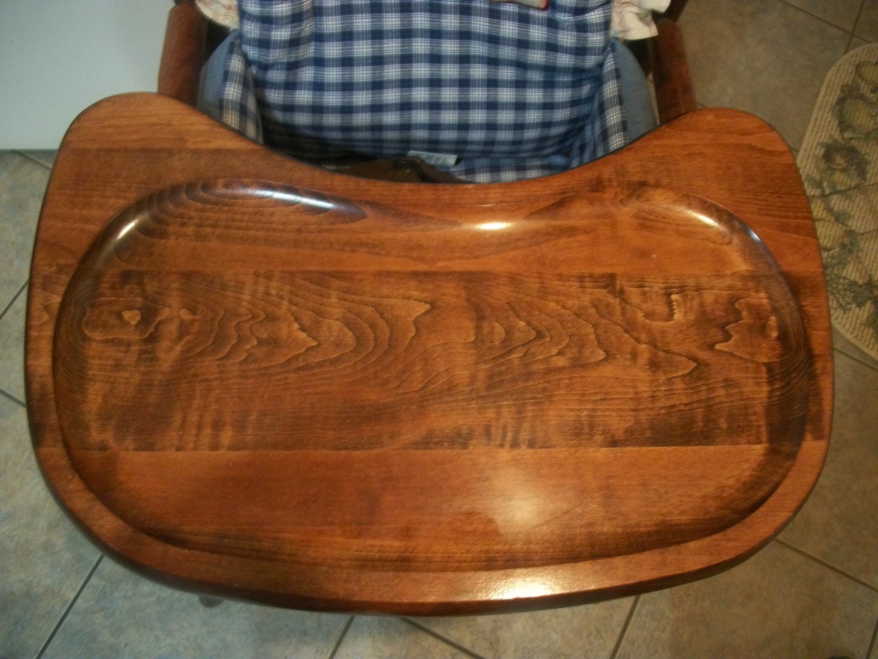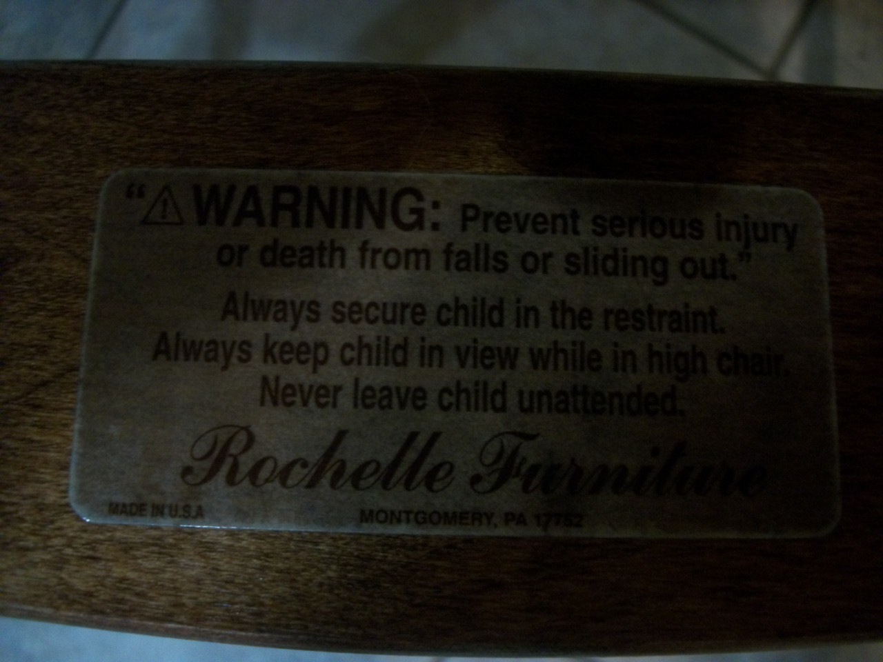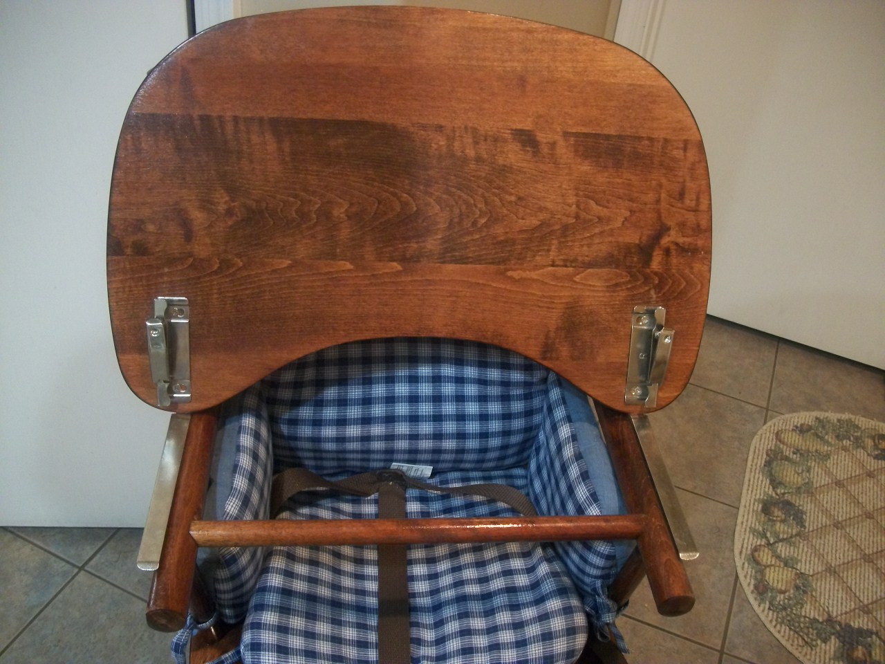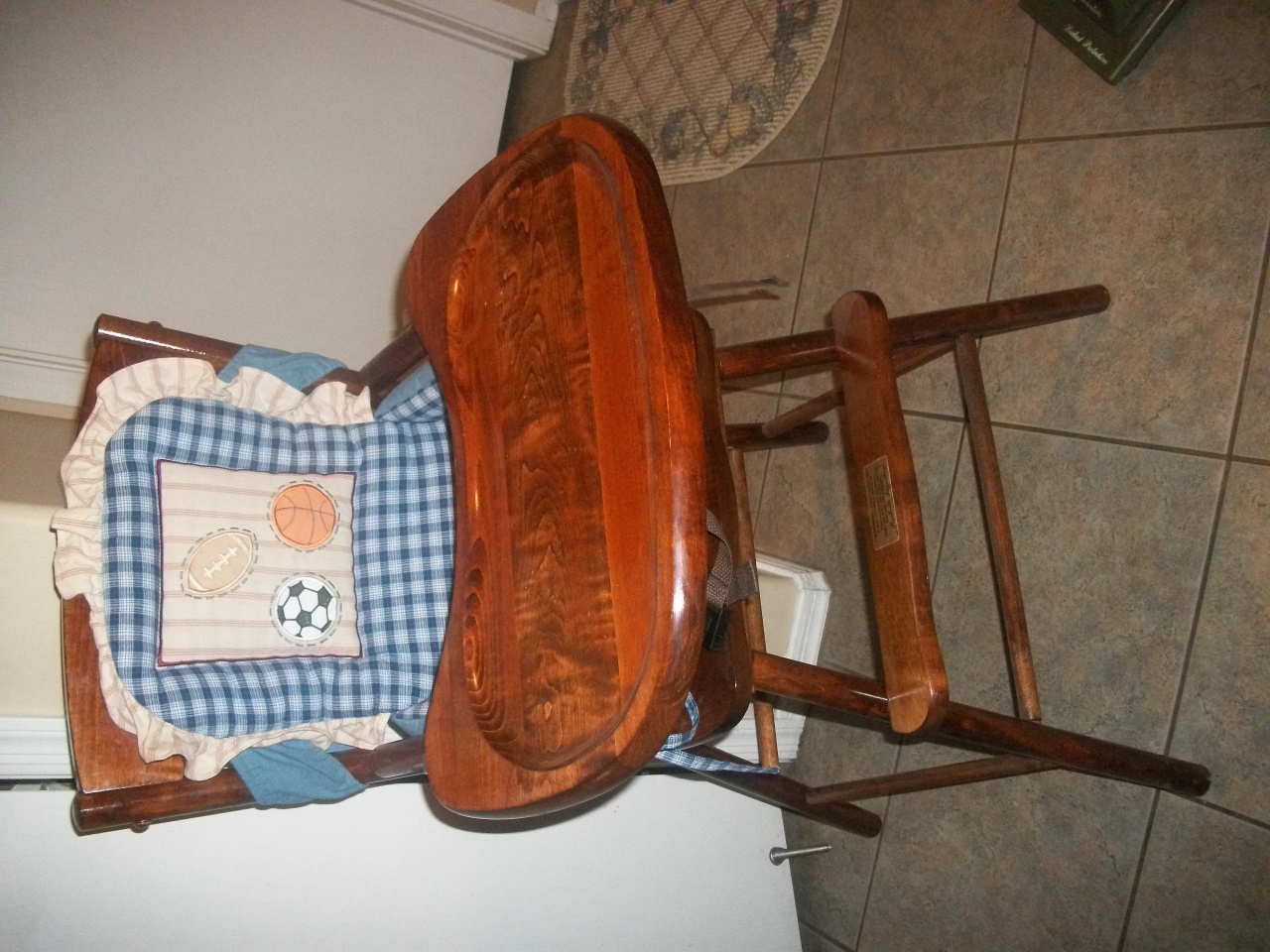 This is a wooden high chair made by Rochelle Furniture in Montgomery, Pa.