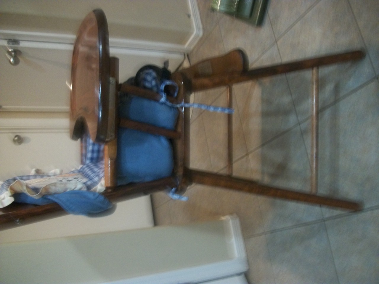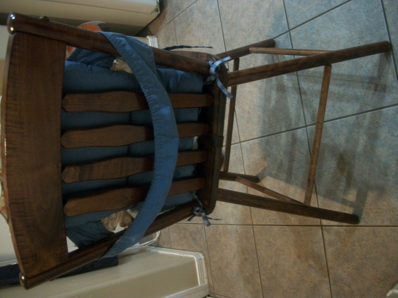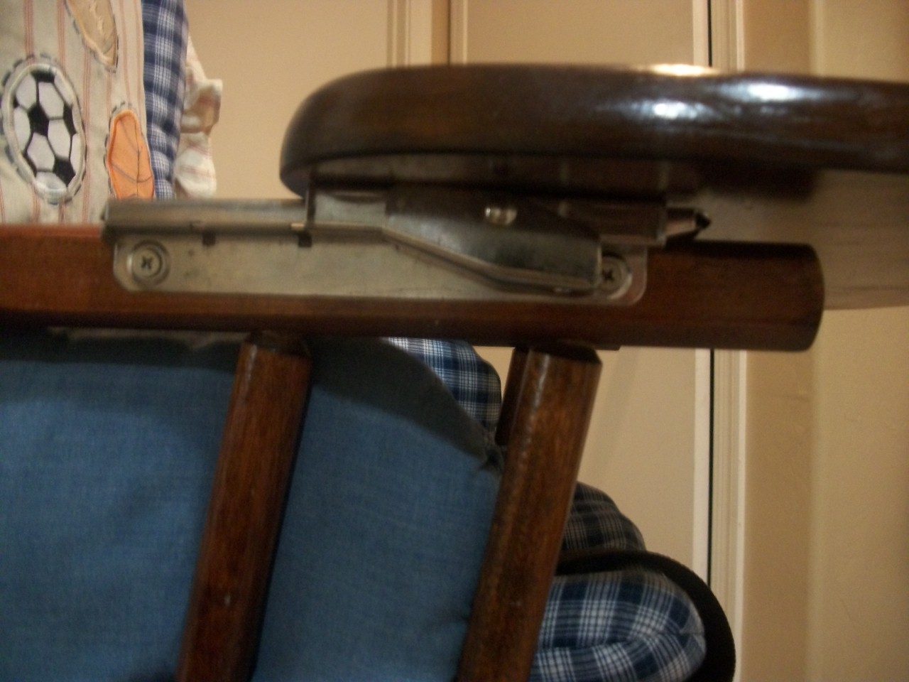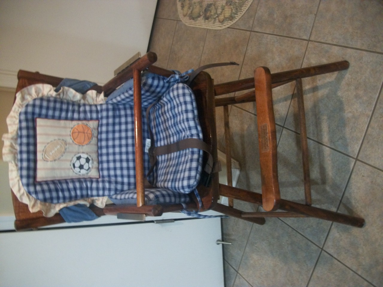 This is a wooden high chair made by Rochelle Furniture in Montgomery, Pa.