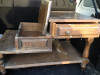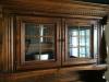 Buffet has two drawers across top - one is felt lined for silver. Three drawers down the middle, two doors (one on each side) with one adjustable shelf in each. Hutch has glass doors - one fixed, two that open, three tiny drawers under the glass doors, Both shelves have grooves for plates, Crown molding at the top.
