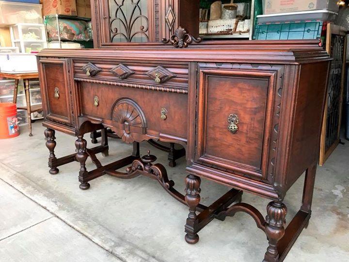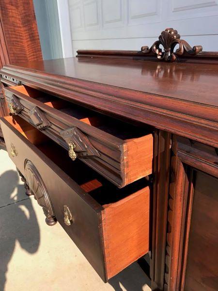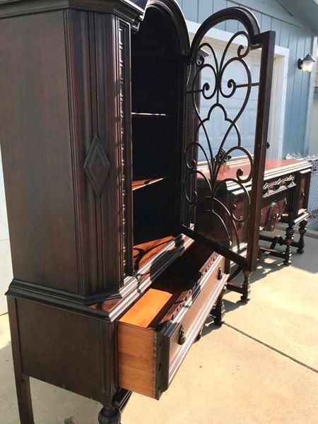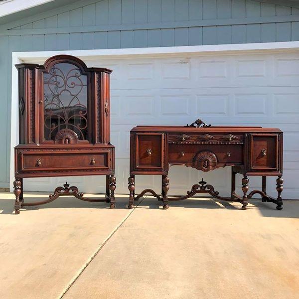 Early Century Walnut, Rockford Superior Furniture. Fantastic condition. Solid, sturdy and very heavy. Buffet measures 70x 38.5 x 22 and China hutch measures 70.5 x 44 x 17. Small crack in glass in top right corner of hutch.