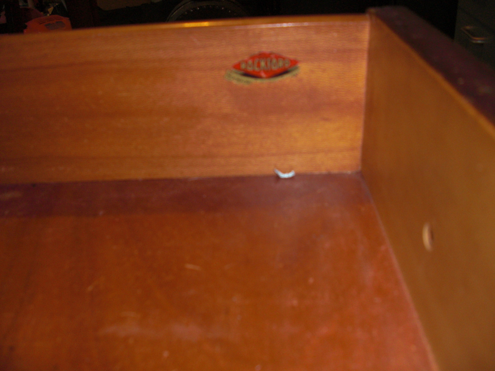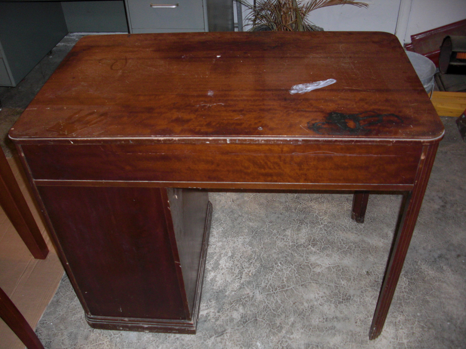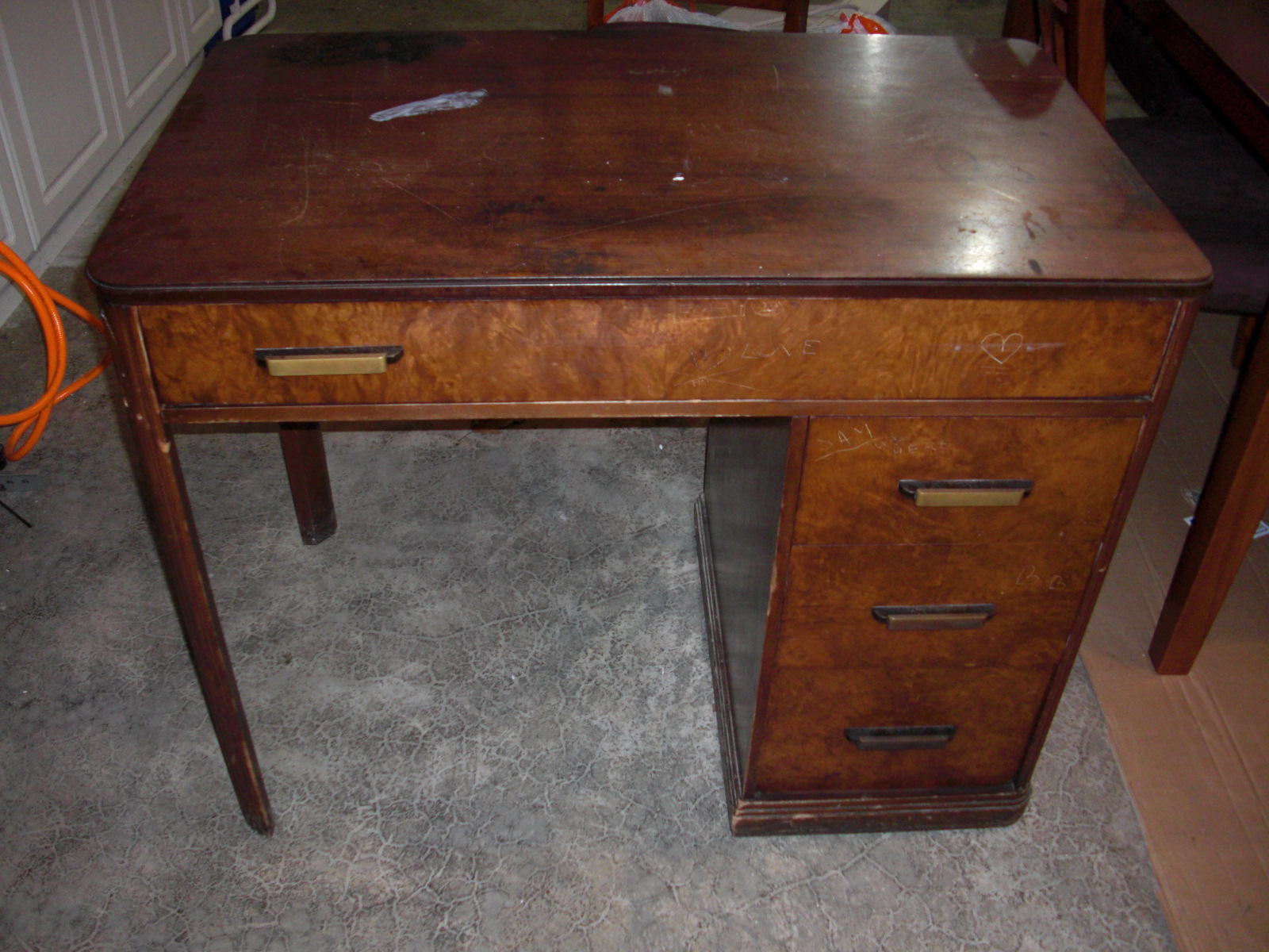 I'm just trying to get an estimate of the value of this desk. It came out of a metal stamping factory my father owned in Rockford, IL. I believe it was a textile factory previously. I can tell it was made by the Rockford Furniture Company by the remnants of the sticker inside the drawer. The wood is highly figured, but I'm not sure exactly what type of wood is used - maybe walnut or mahogany? As you can see, my kids decided it would be nice to write on - literally! Please let me know if anyone has any information they can pass along. Thank you for your time.