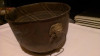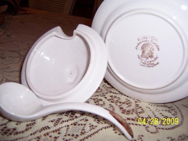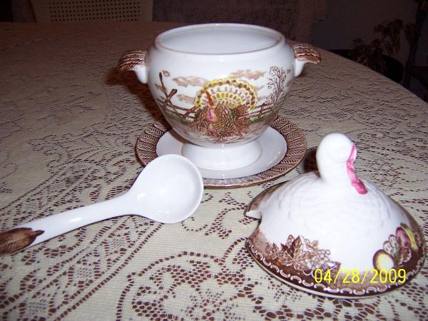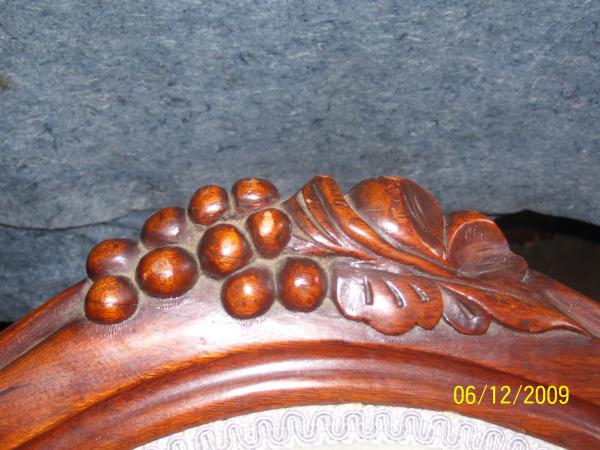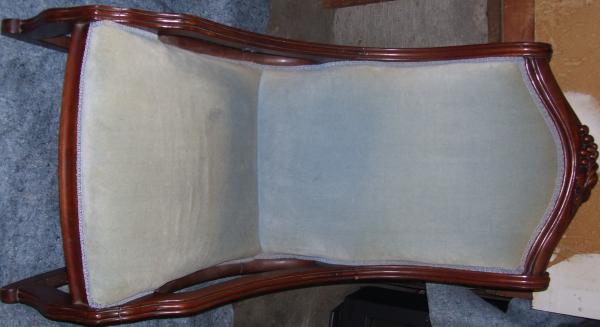 It's a very beautiful rocking chair. It's made out of wood and it has very soft blue-green fabric. It has been reupholstered. Unsure about what type of upholster it had before. On the top of it there is a grape bunch with leaves carved on the wood.