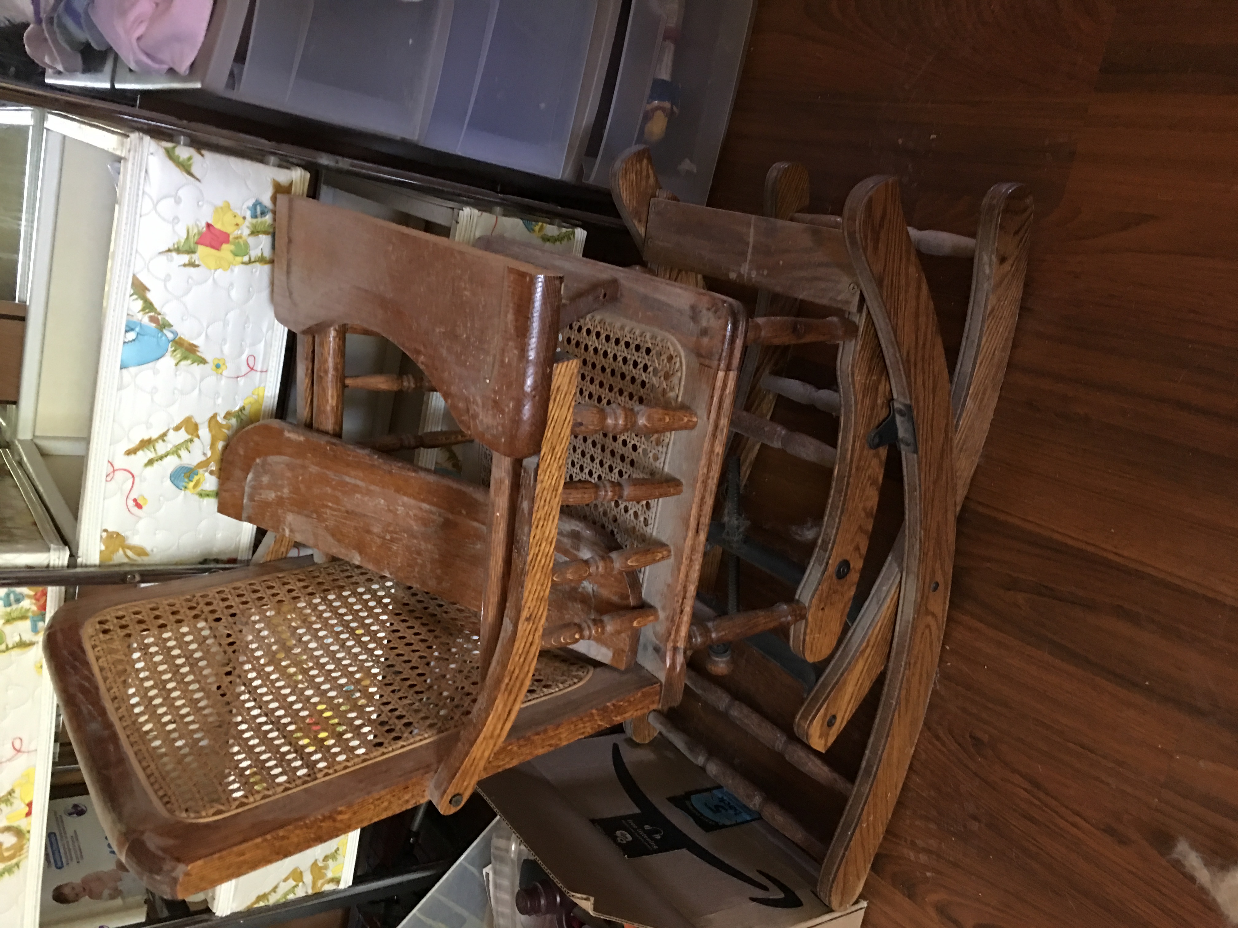 Wooden rocking highchair with a hand crank to adjust the hight.