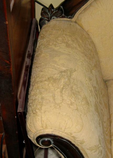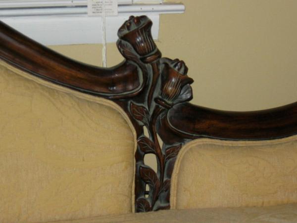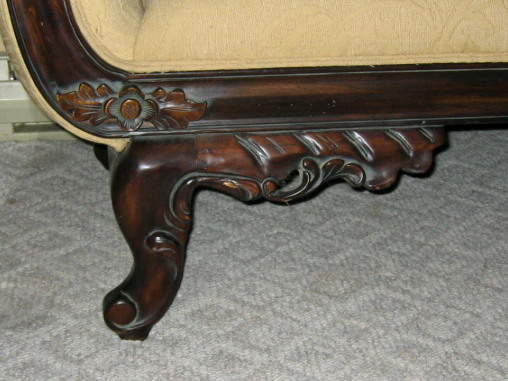 I am thinking about buying this fainting couch. Need info on manufacturer and what the wood is made of and price value. There is a chip out of the top carved wood shown in picture #2. Any info would be greatly appreciated. Martha Wright