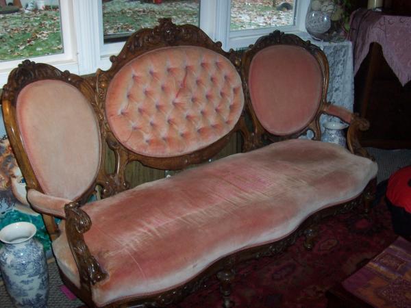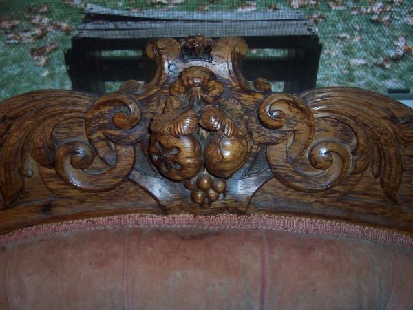 Wooden fruit carvings on back and frame of couch, original everything, horse mane stuffing in fabric, made in the 1800's. The wood carving is in excellent condition never been tampered with its originality.