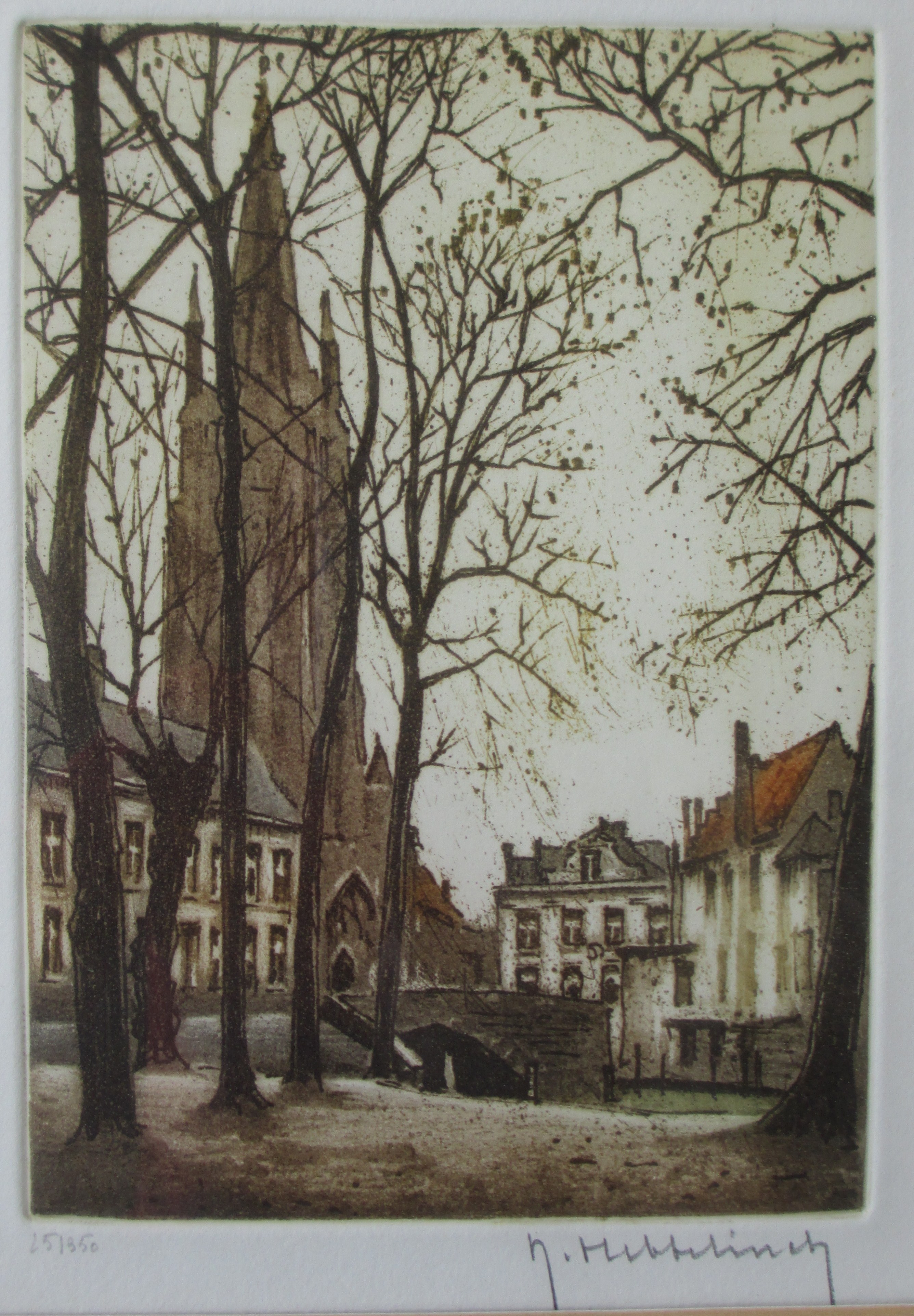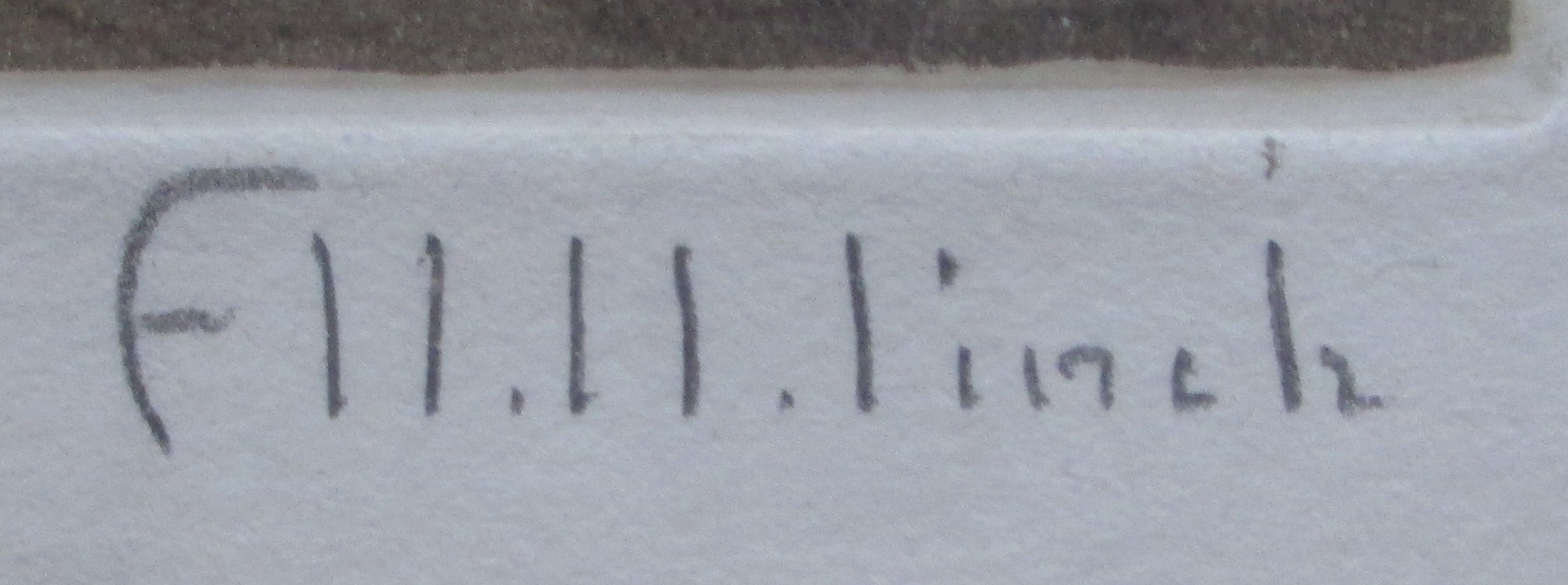 My evidence linking this etching to Hebbelinck is based on two smaller 5”w x 7”h etchings I also inherited. I don’t know their titles but have matched the signatures to Roger R. Hebbelinck via the internet. These etchings also have the same notation: