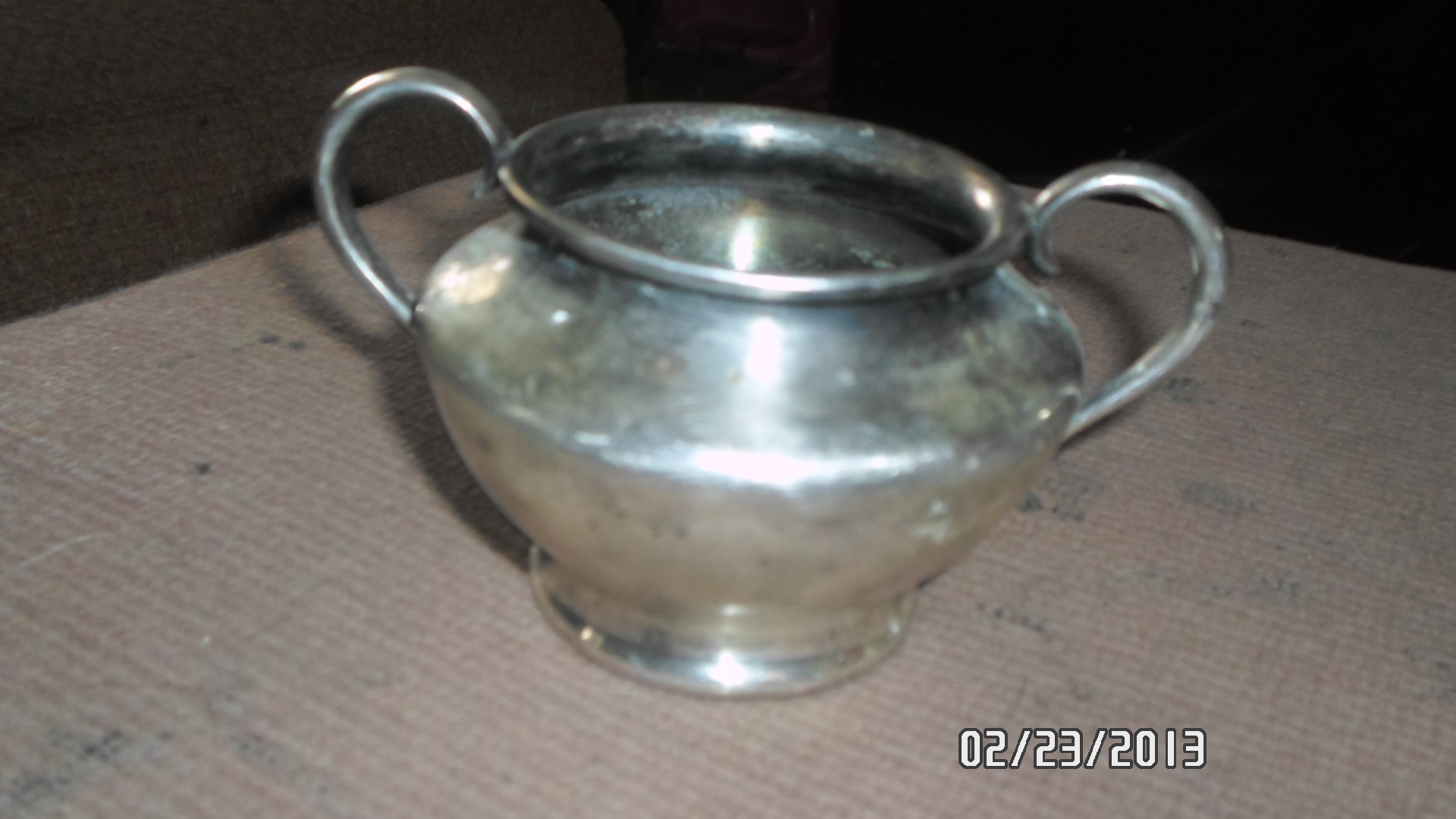 It is silver or silverplated sugar bowl with no lid. It has handles. The name on the bottom is Rogers with an anchor on each side of the name. The number under the name is 2462.