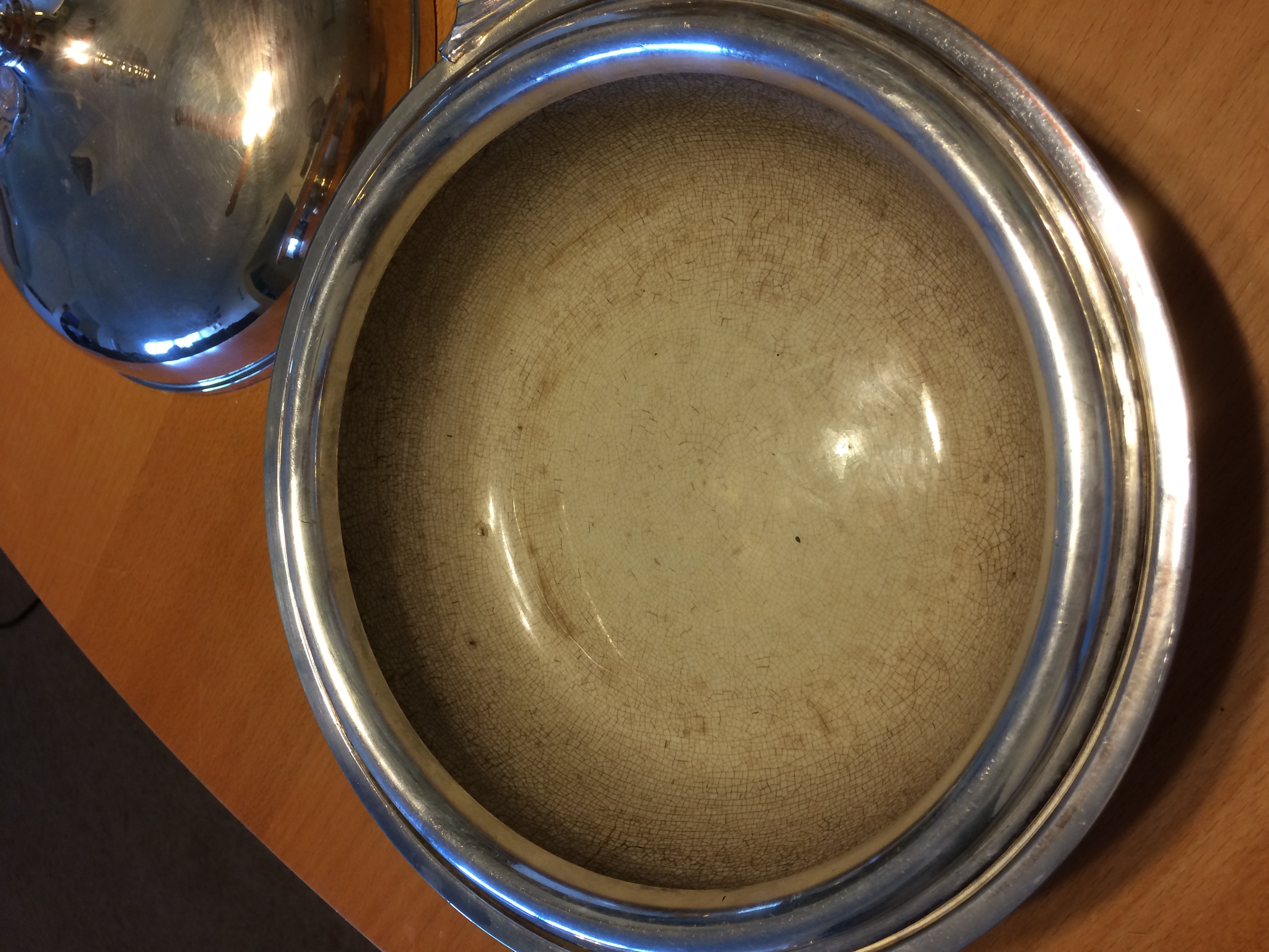 A serving dish (with cover) that I bought at a garage sale is marked with a Rogers Bros Triple Plate 2I 3I on the bottom. (with a fist emblem). Inside the dish was a serving bowl with much crazing and an Lion and Unicorn emblem on the bottom side, also marked with Ironstone China J.M. & Co. They seem to not be made together, but at the same time, the bowl seems to fit perfectly inside the dish. The silver dish was extremely tarnished and I cleaned it up today.
