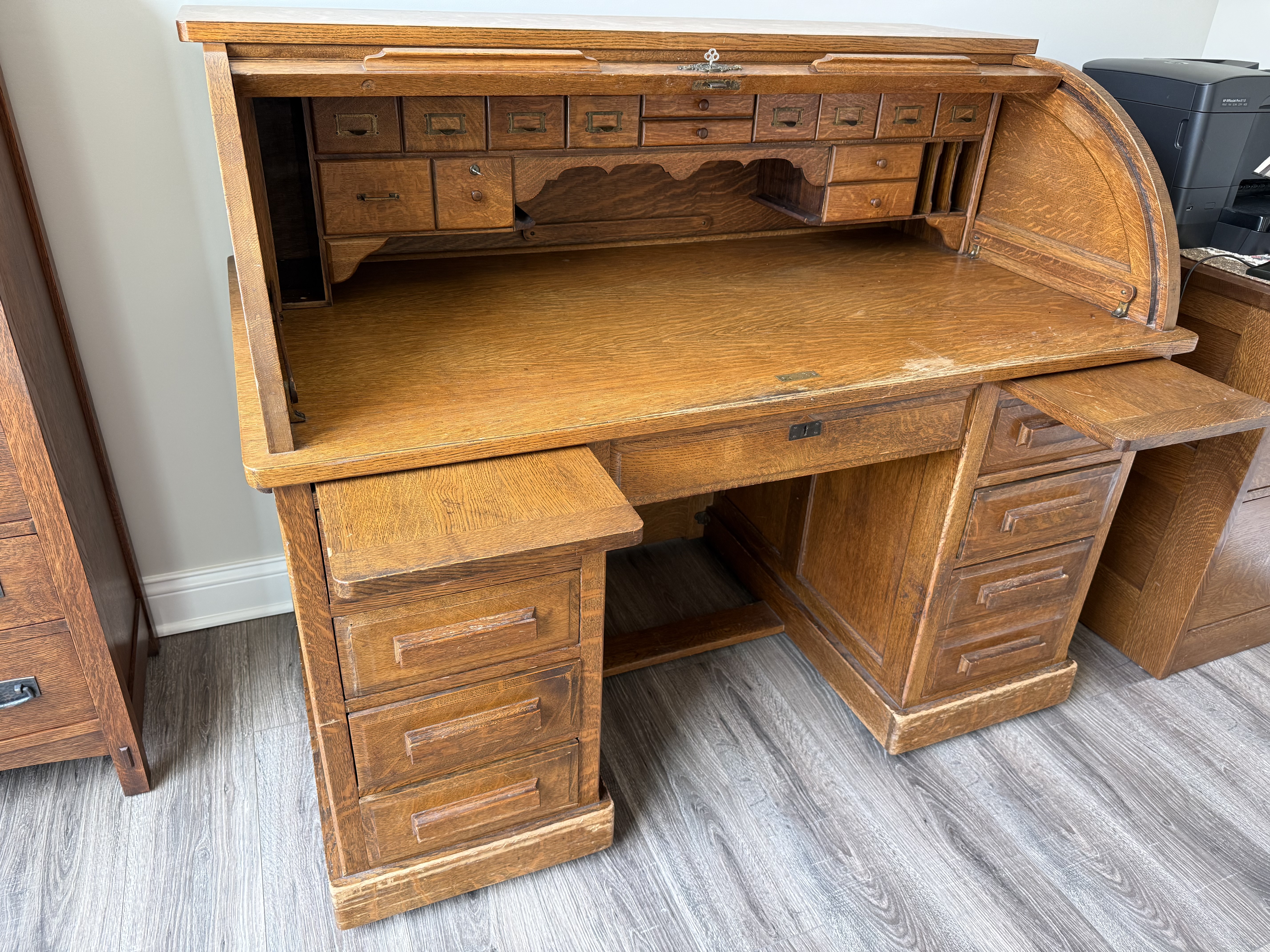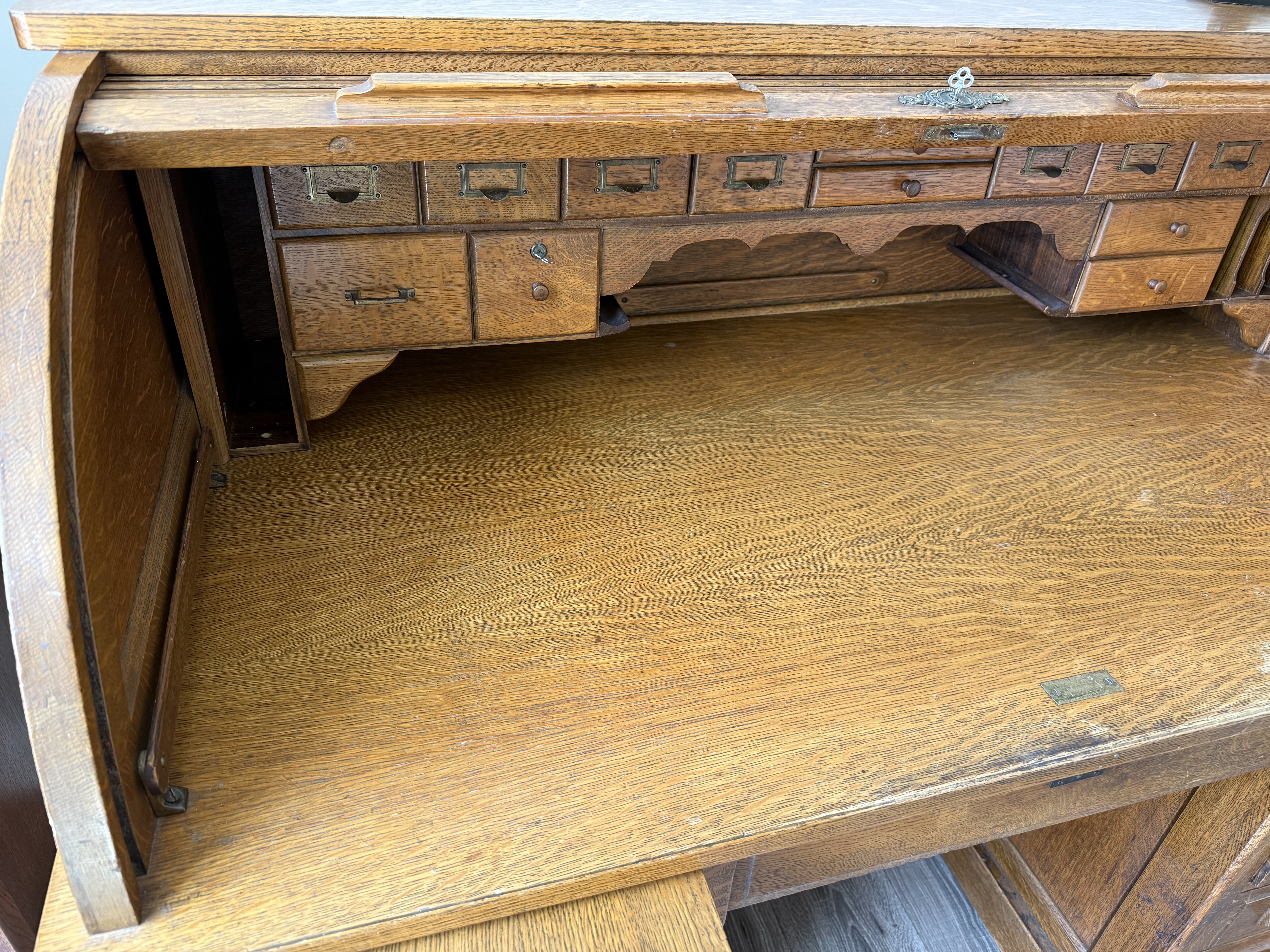The desk's construction style, materials, and design elements suggest it was made in the early 1900s, a period known for the popularity of roll top desks.