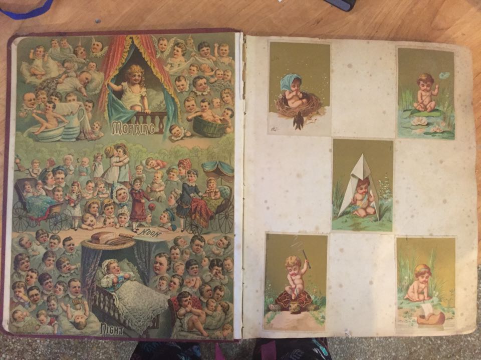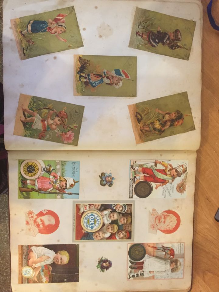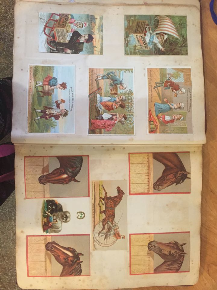 Roman-Grecian Victorian late 1800's scrapbook. I believe all pages still in tact and each is filled with a variety of many different styles and types of collector cards from that time. Best to my count more than 80 pages. I have pics of all. Here are some photos of a few of the pages.