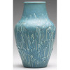 Rookwood pottery vase in very good condition. Approximately 12" tall with a rounded base, narrow neck and 3" to 3-1/2" opeining at the top. Matted finish with bird/tree motif. Gold accent around the neck and top, with yellow finish inside the vase. A small hairline crack inside the opening of the vase, not visible from the outside. See photos for markings on the base of the piece.