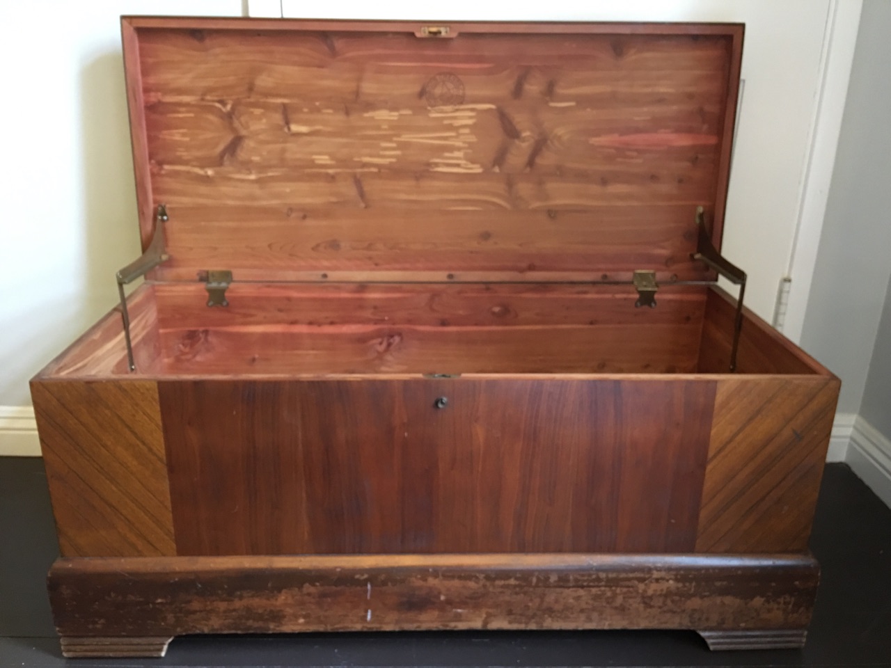 This cedar chest has been in my family for over 50 years and not quite sure when we got it! It was in my bedroom growing up and has a lot of surface water marks and skuffs along the base and feet. If given a little love am sure it could look brand new.