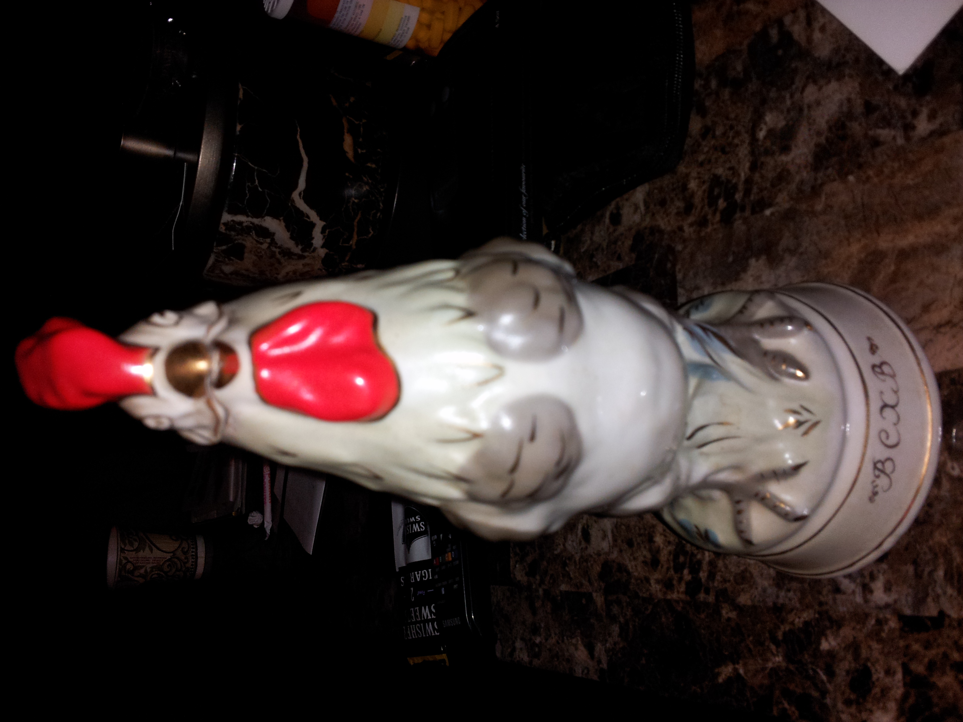 Rooster I think that it is Russian. I am also pretty sure that it is a milk pitcher since the head can come off. This is my first time so if there is anything that you would like to know just ask. None of the writing is in English but I do have pictures of the writing