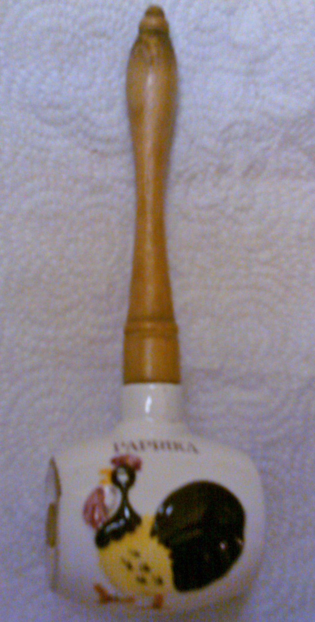 I have a question about a paprika shaker I have. It appears to be from the 40's due to the fact it only has "Japan" printed on the bottom in blue, next to the cork that holds in the seasoning. This shaker is in the shape of a mallet, the seasoning part itself is white ceramic or porcelain and the handle is wood and can be screwed apart. It might be about 6 inches in length total, the shaker part about 3 1/3 inches, and maybe 2 in diameter.