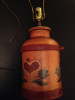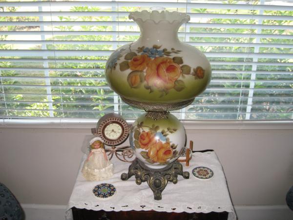 The lamp is 2 large glass globes with roses painted on, connected by metal. The base is quite heavy compared to the rest of the lamp.