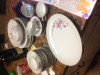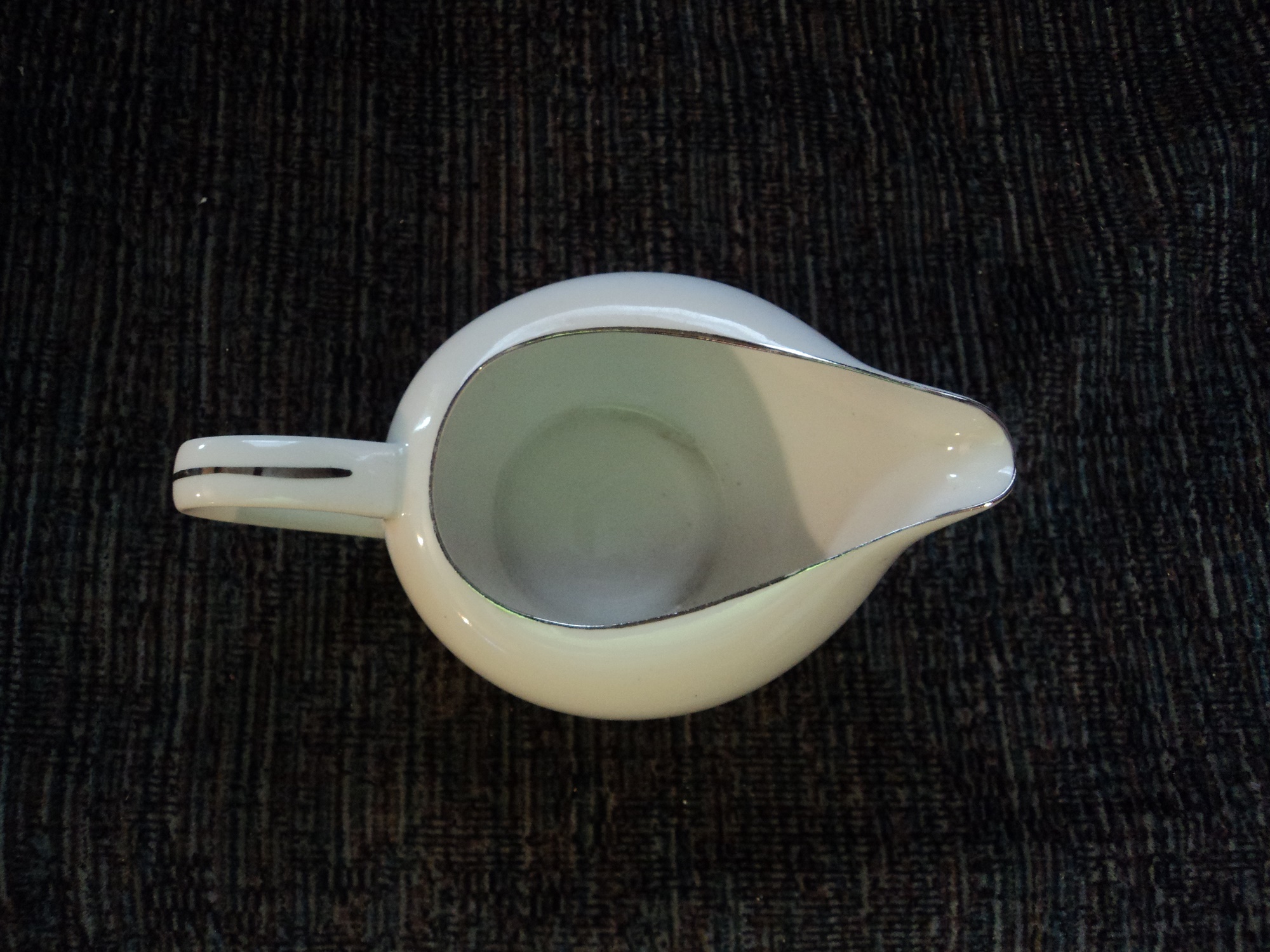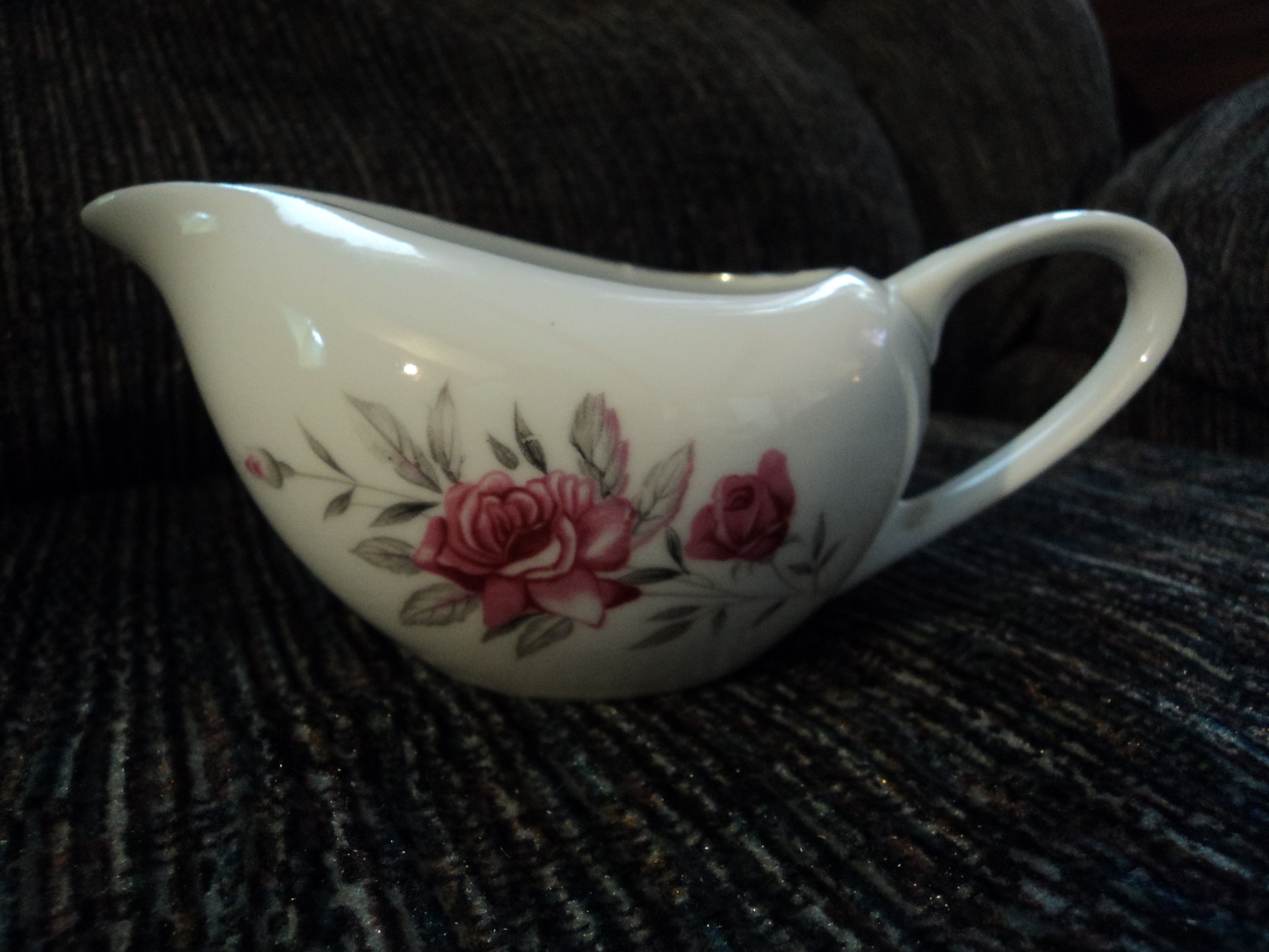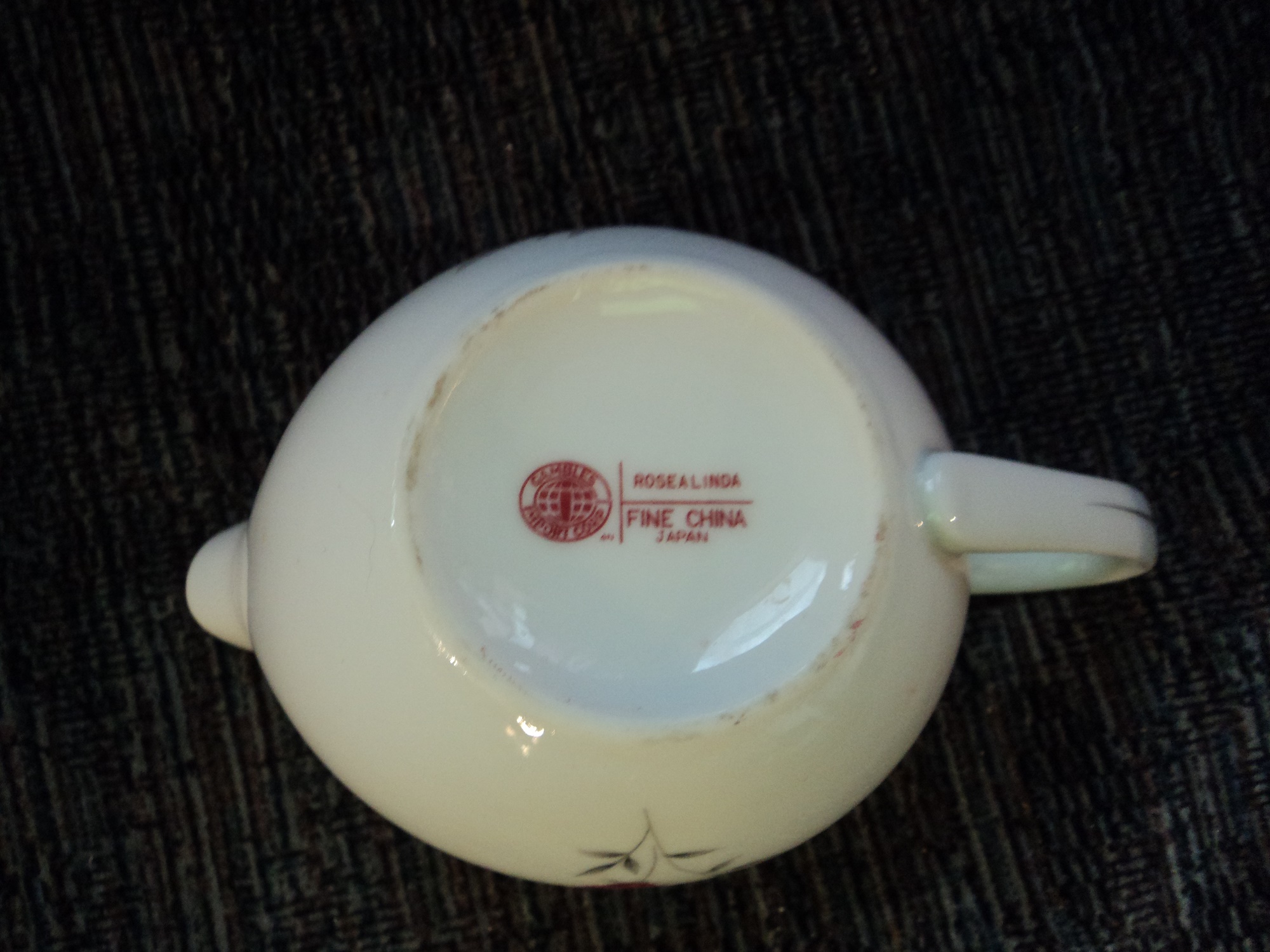 Stamp on bottom, single rose on one side, three roses on other side,silver trim.