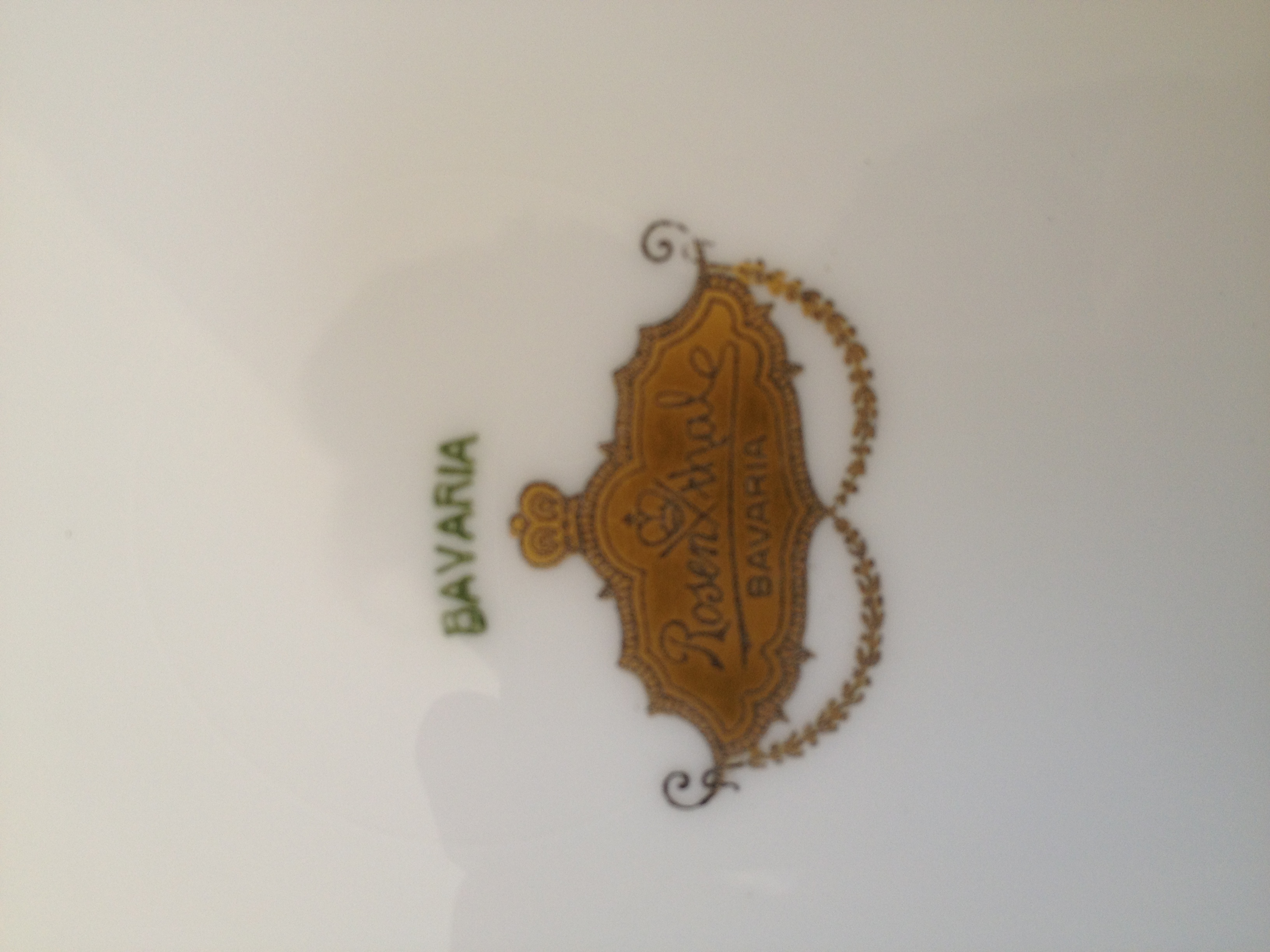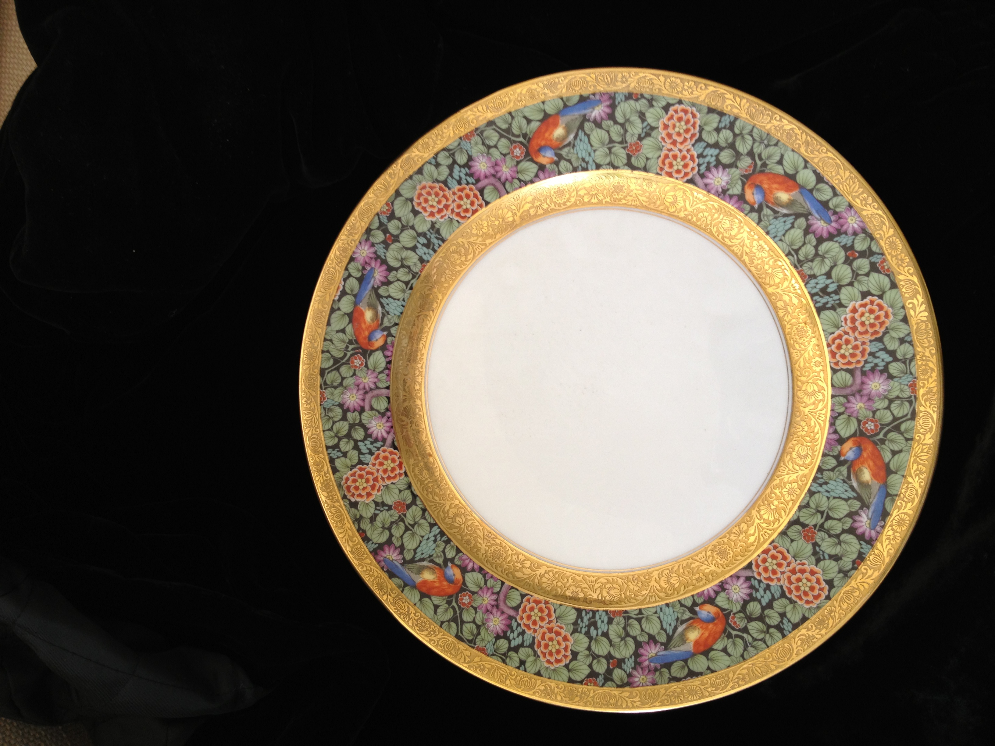 Twelve dinner plates.  Mark on plate is Rosenthal Bavaria.  Two bands of gold with a floral pattern and intermittent blue and red birds.  Stamped above the Rosenthal mark in green is the word "Bavaria."