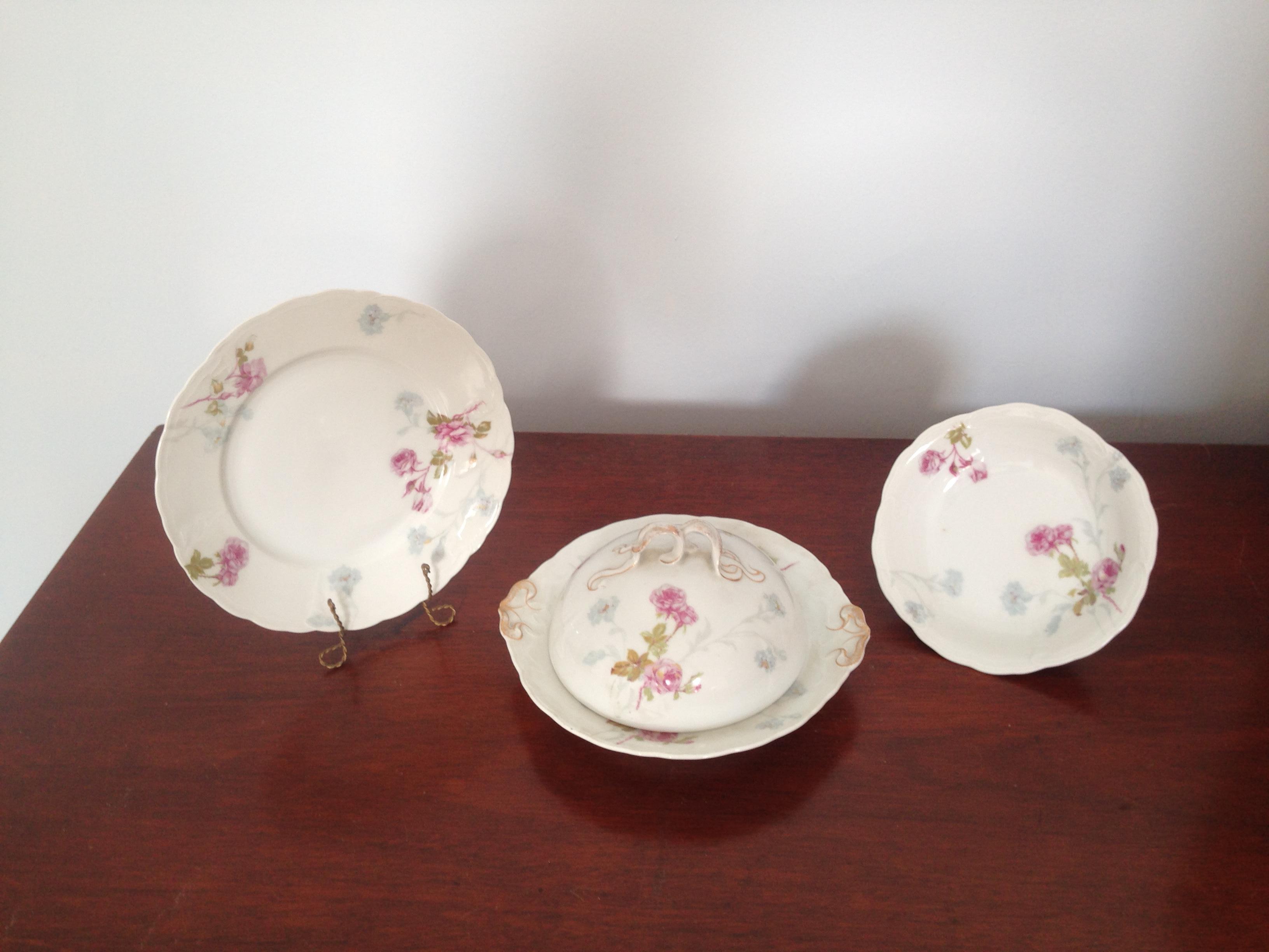 I have inherited china from my great grandmother. The mark indicates that it was purchased between 1891 and 1906 which time period corresponds with her life. The serving pieces all have handles that look like they are made of 2 ribbons of china that curve around each other where they meet.. Or one long piece with a twist in the middle you could say. The edges have a slight scallop to them. They are almost transluent. I have never seen any porcelain that looked this thin and delicate.