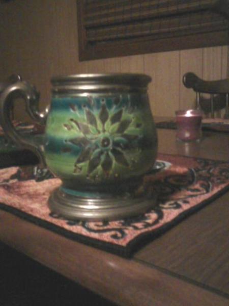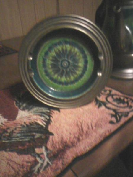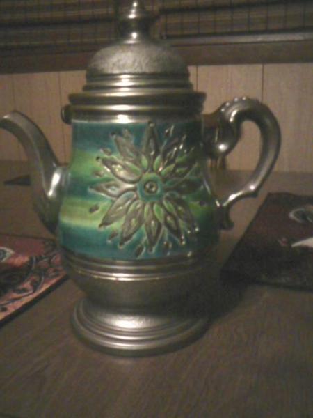 These pieces I found in my attic when I purchased this house.  They are in mint condition.  They all are of a silver color with bright blues and greens.  The entire set includes a ashtray, coffee urn, creamer and sugar bowl.