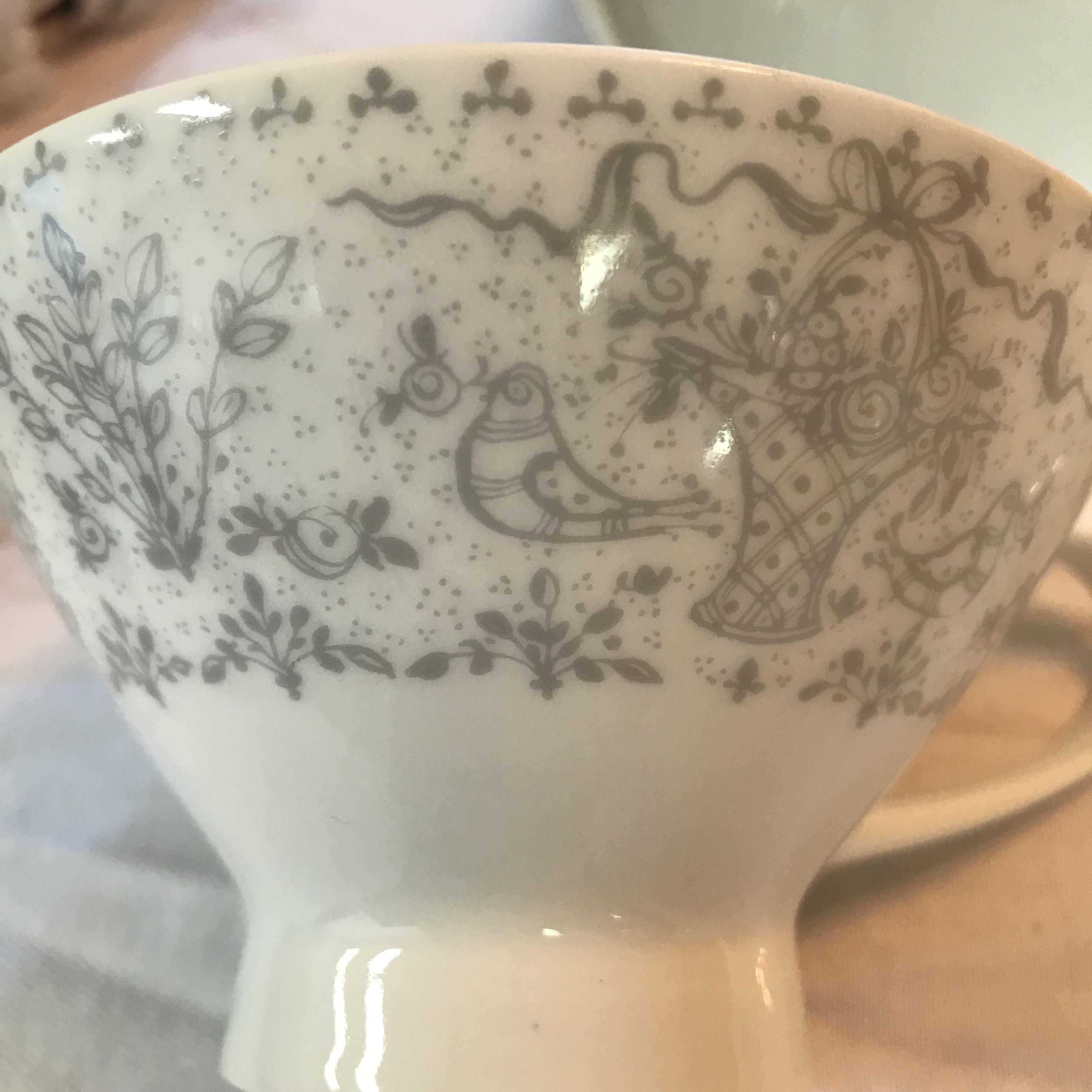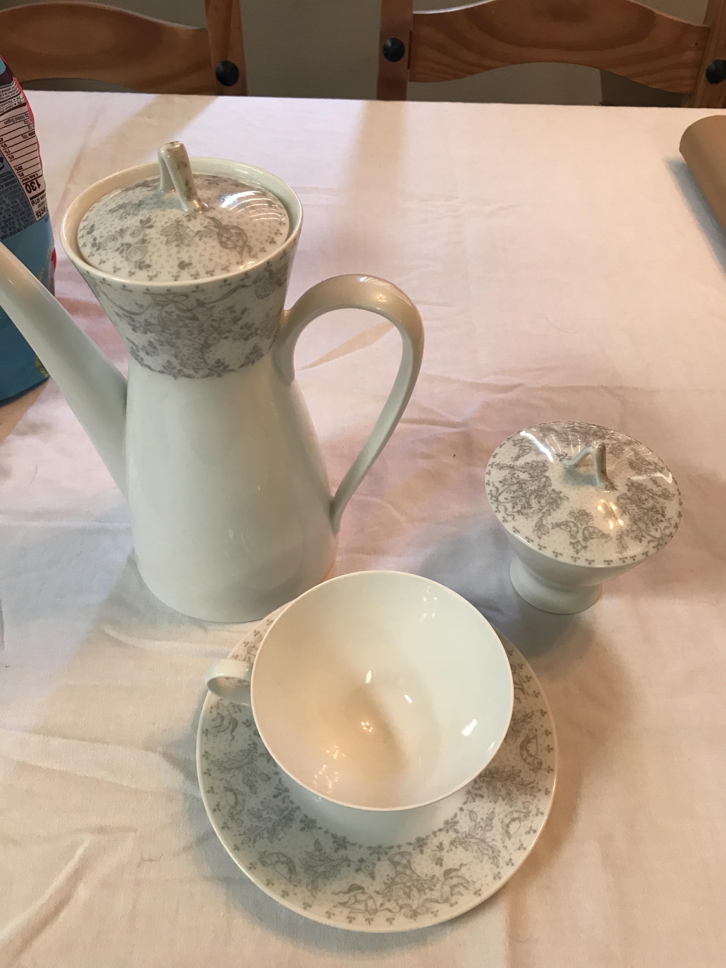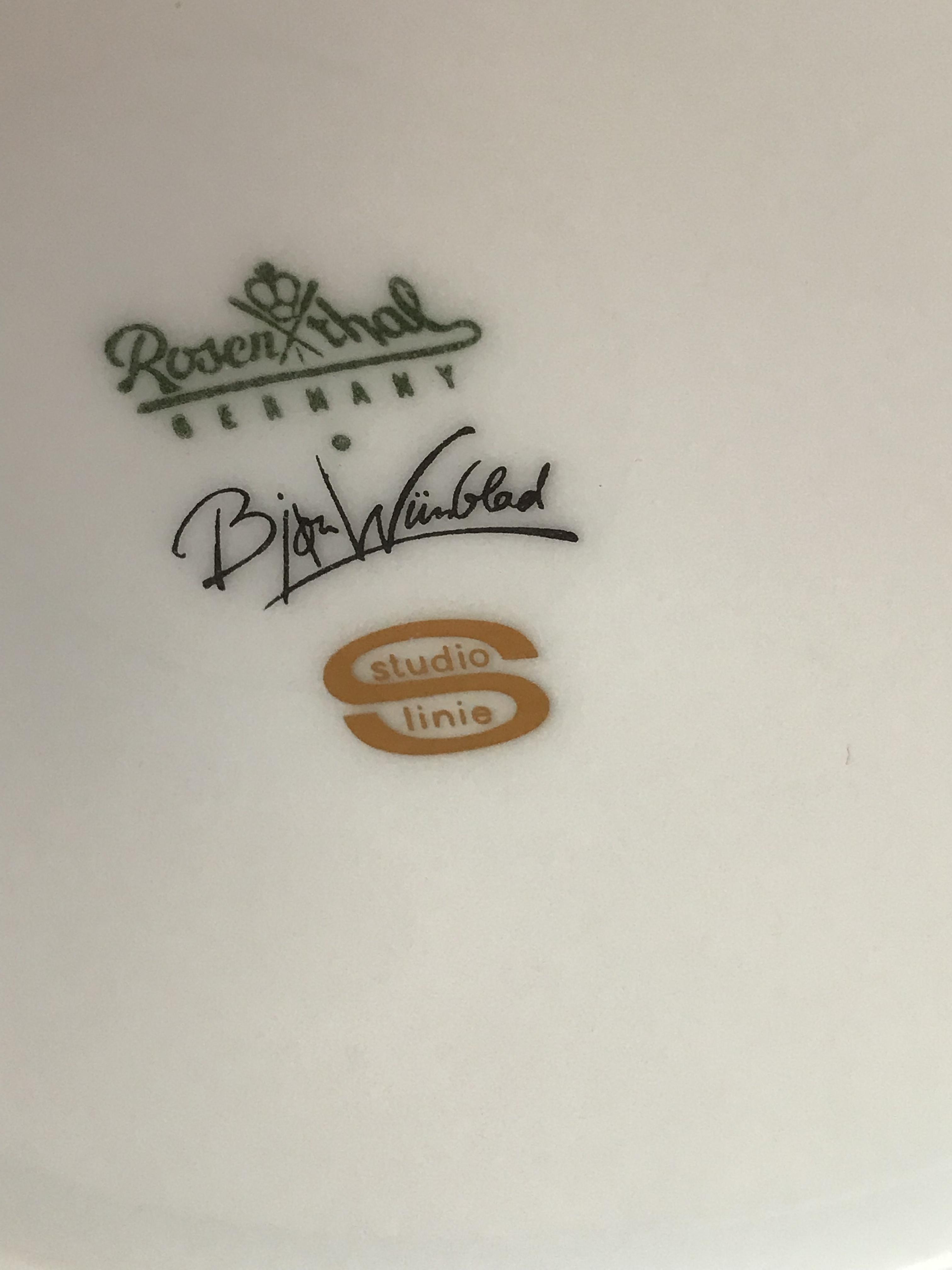 I have a coffee pot, cream or sugar container, 8 cups and saucers and a platter. I cannot find the name of the pattern anywhere. I believe it is from 1961 or 1962. It’s white with birds and vases. The coffee pot is signed by Bjorn Wiinblad and is stamped Studio Linie. Can anyone tell me the pattern and/or the approximate value?