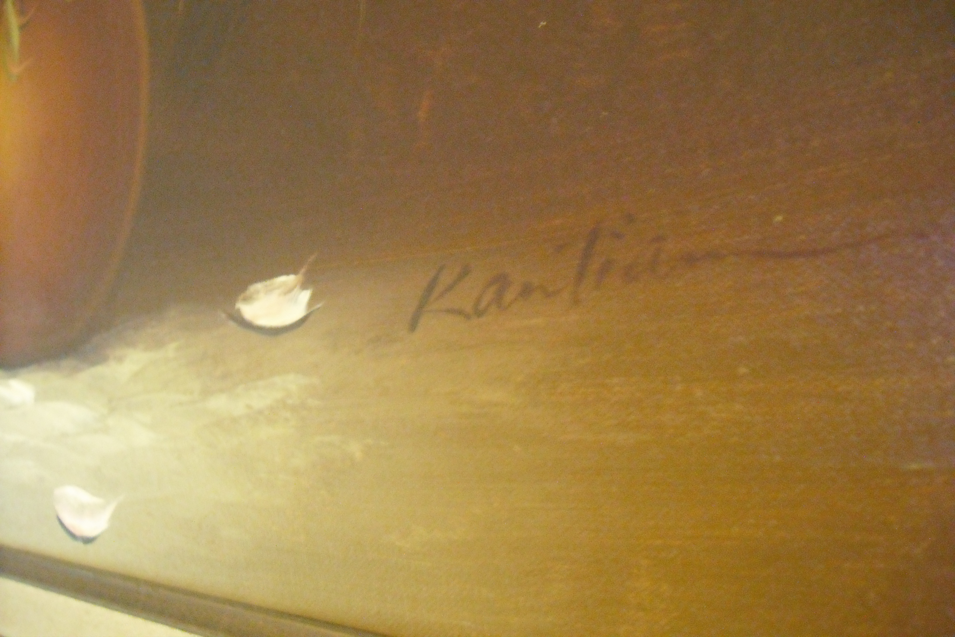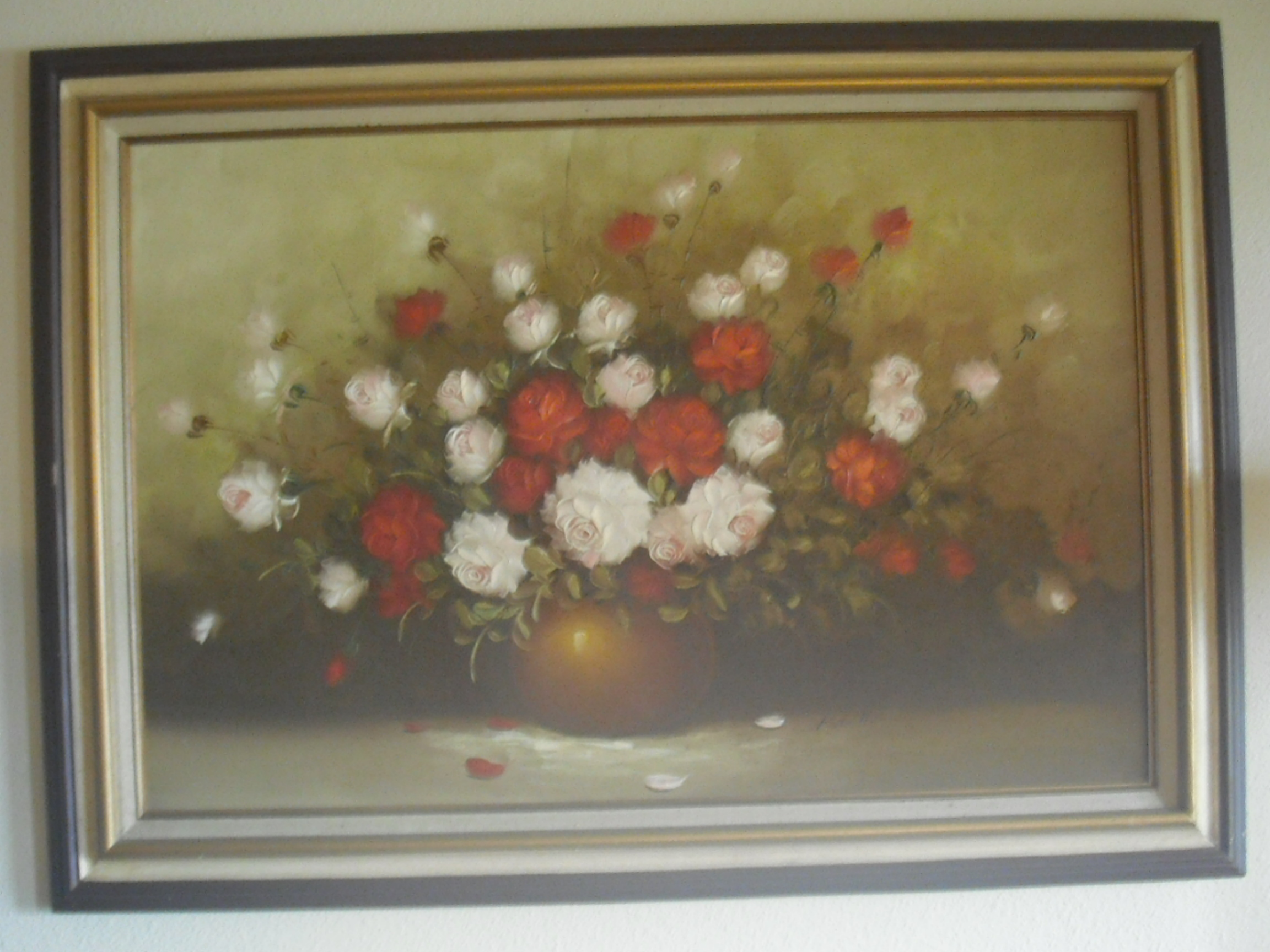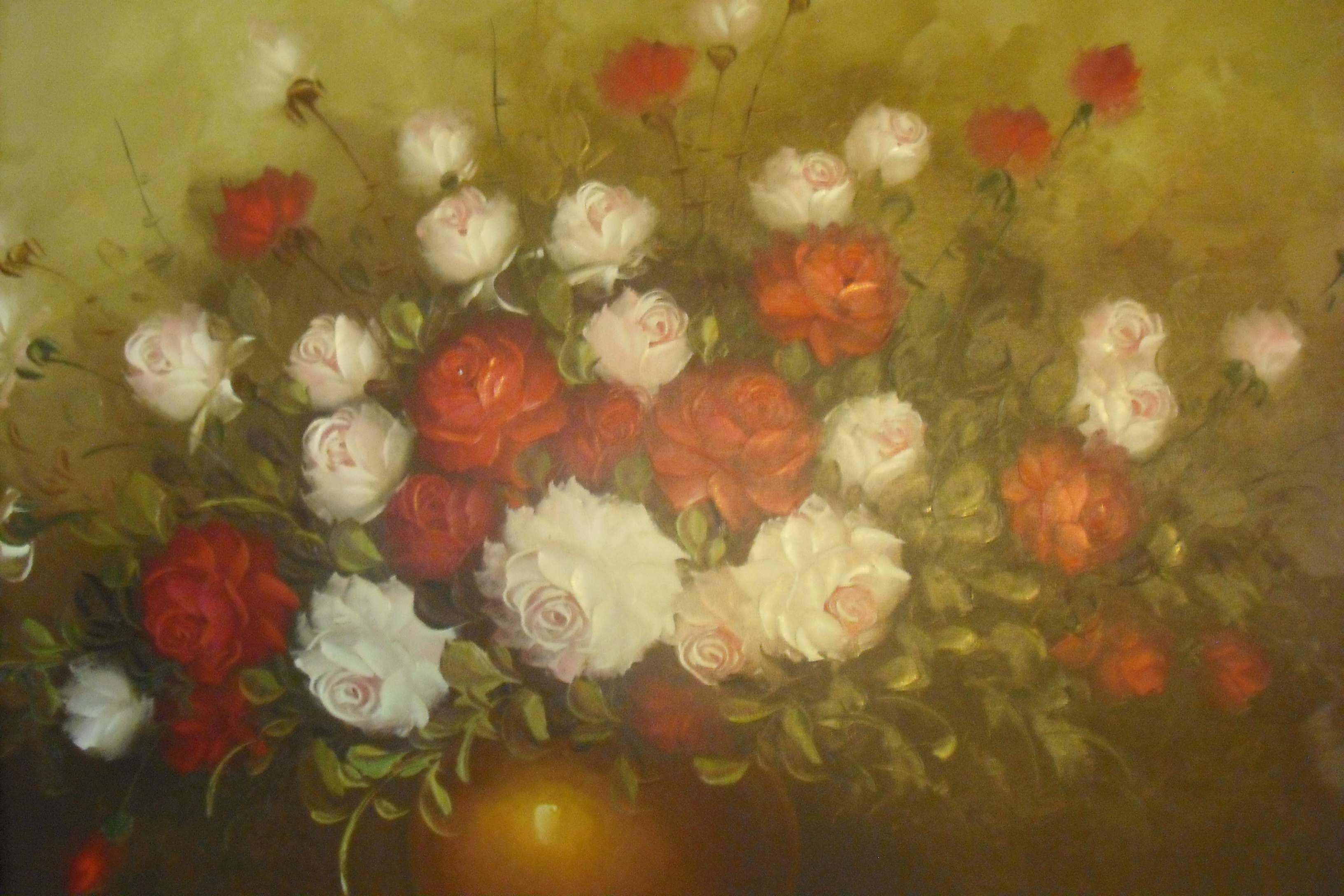 It's an oil painting of flowers on canvas on bronze or brass vase.