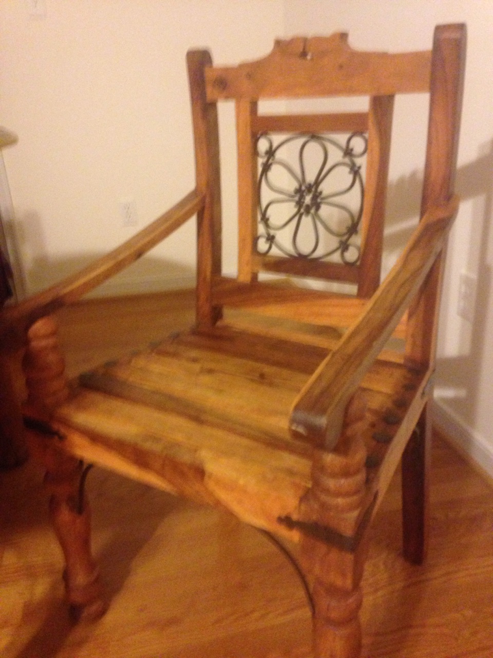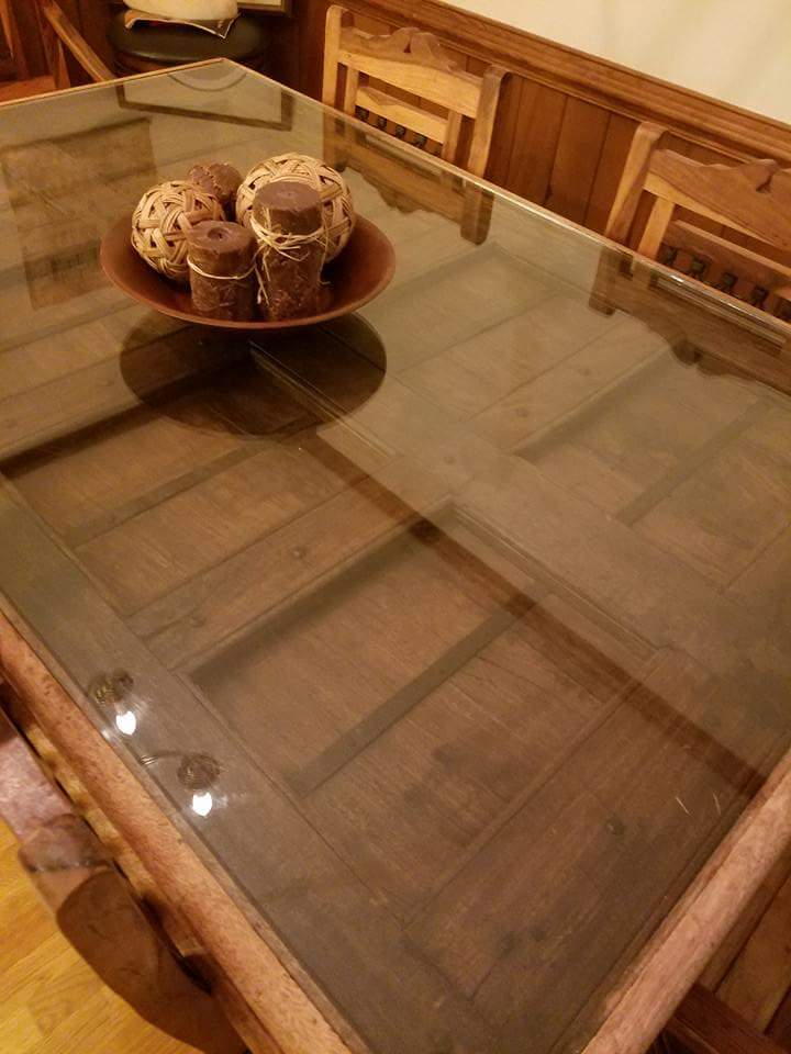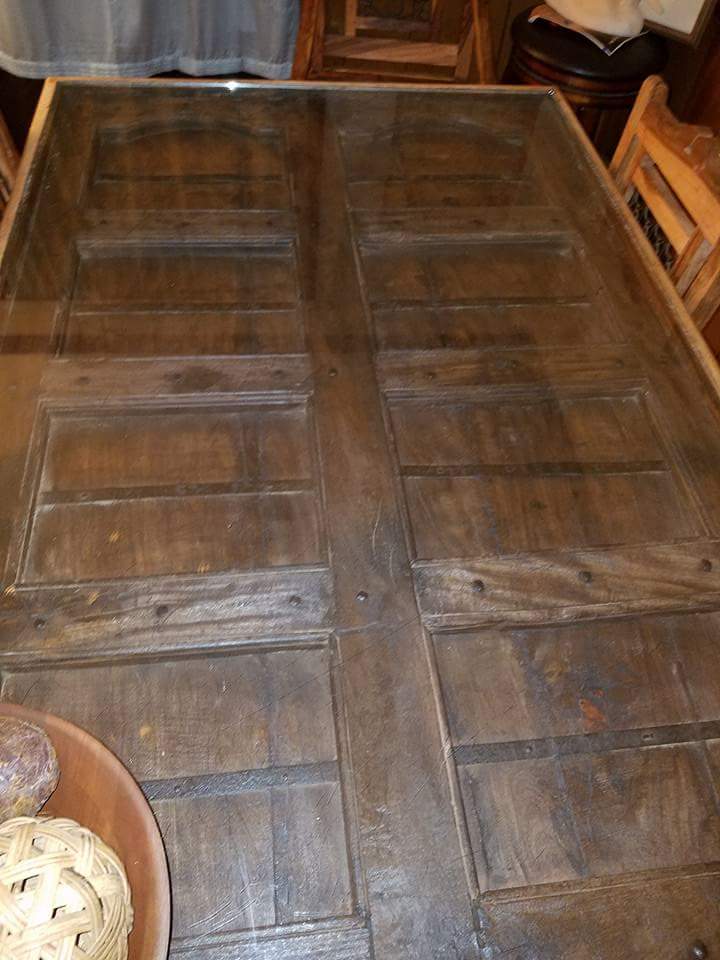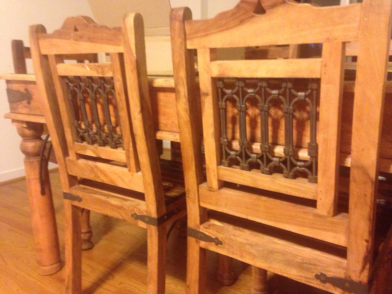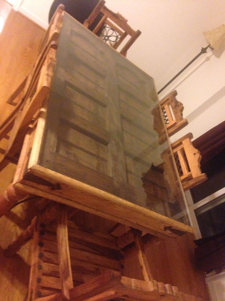 Rosewood dining room table and chairs. Iron detail. The table top is a door with thick glass overlay.