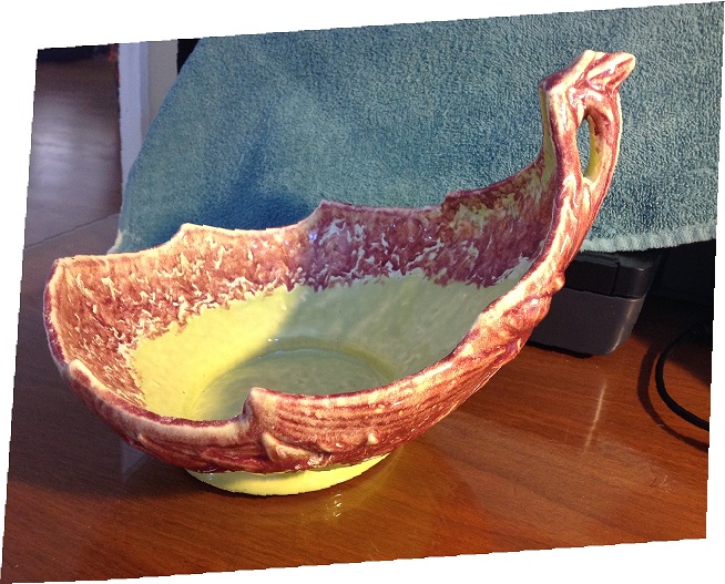 ANOTHER ITEM IS A MC COY BOWL THAT I PURCHASED AT THE SALE. IT IS AROUND 10 " AND KIND OF LIME GREEN AND BURGANDY. AGAIN IF YOU CANT ELL ME ITS AGE AND VALUE .