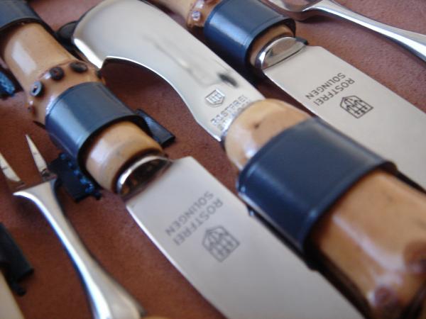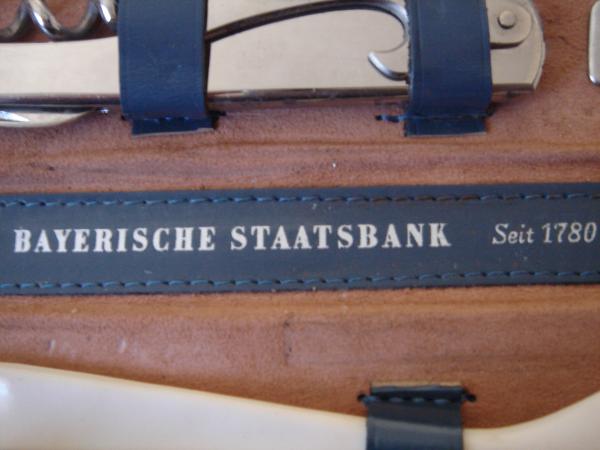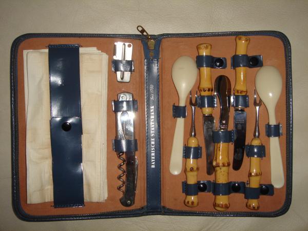 picnic folder/basket/set by rostfrei solingen in great condition. aloso has bayerische staatsbank seit 1780 stmped inside of the leather.
