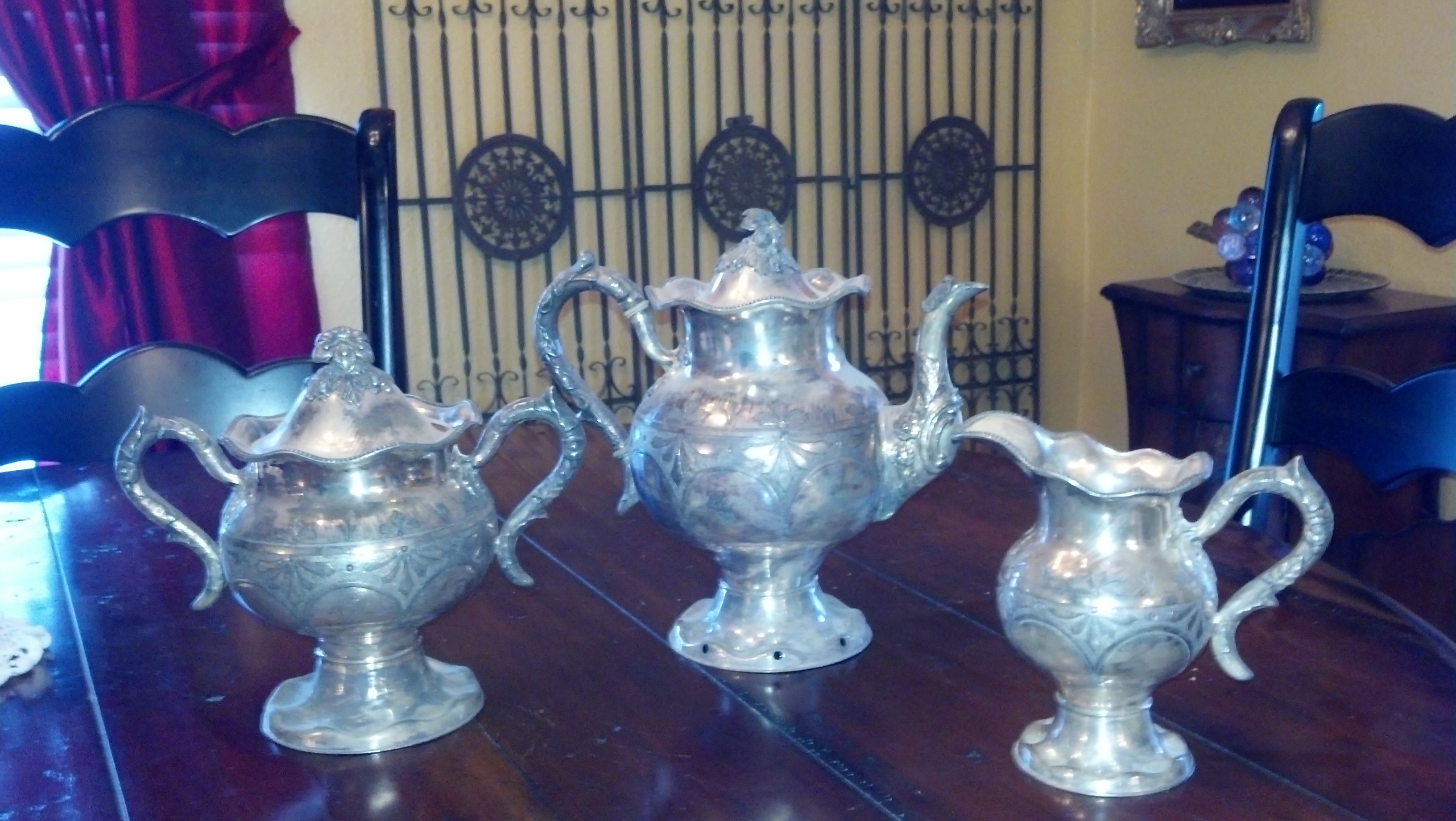 I have a partial Roswell Gleason & Sons silverplate tea set, which includes the tea pot, creamer, and covered sugar bowl. All are in excellent condition. The tea pot is not marked, but the other two pieces contain the warrior/bow mark on the bottom. I have included a close up picture of the pattern that appears on all three pieces; the lids have a lilly on top. All three are monogrammed with "Lidie W". There may be a waste bowl also, but it may still be packed away. I am curious about the history on these items (age, origin, pattern, etc) and how much they might be worth.