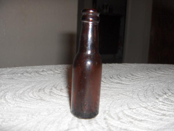 Round brown glass bottle, There is something on the bottom of the bottle that I .can't make out, the base is 1" in diameter, and the bottle is 4" high.