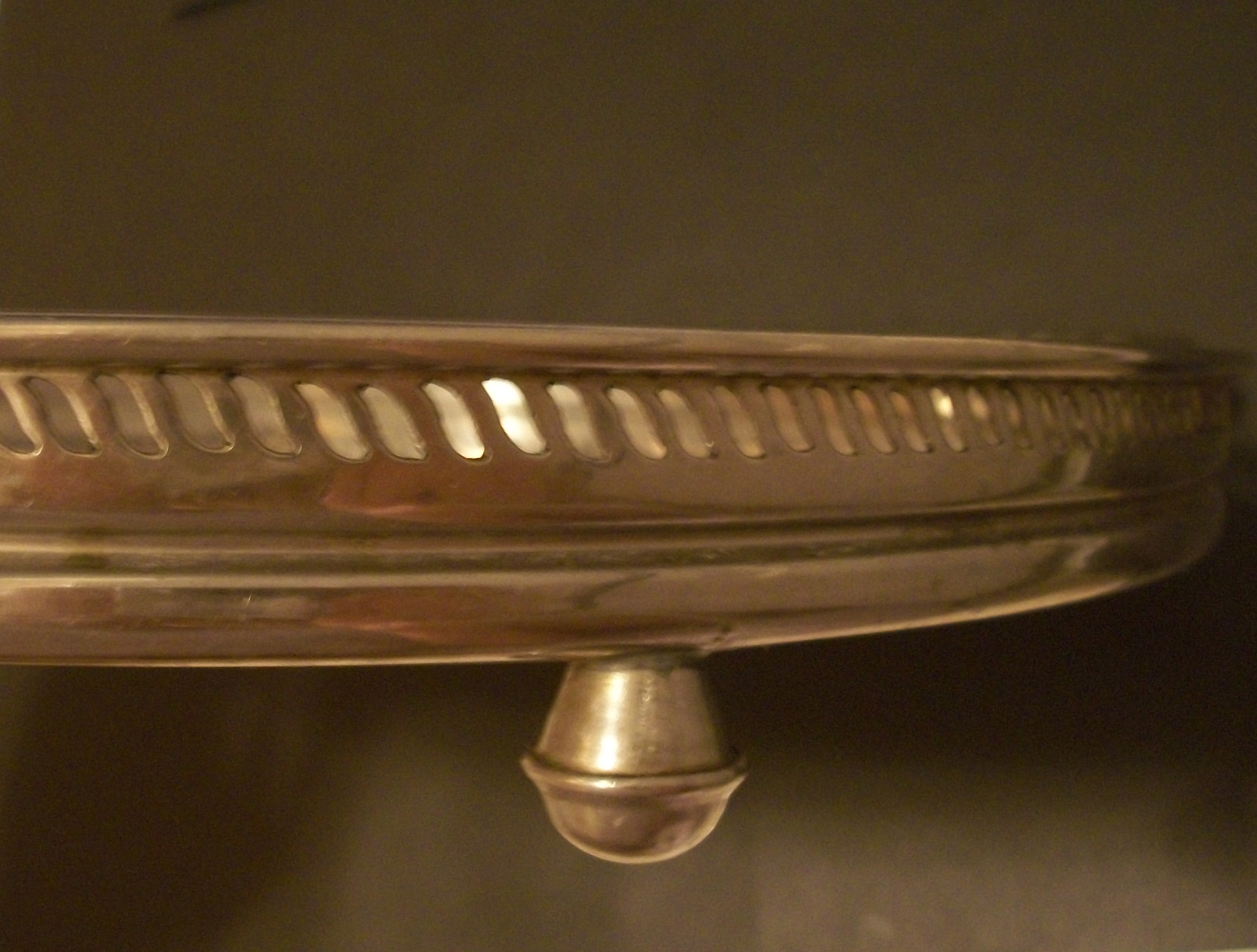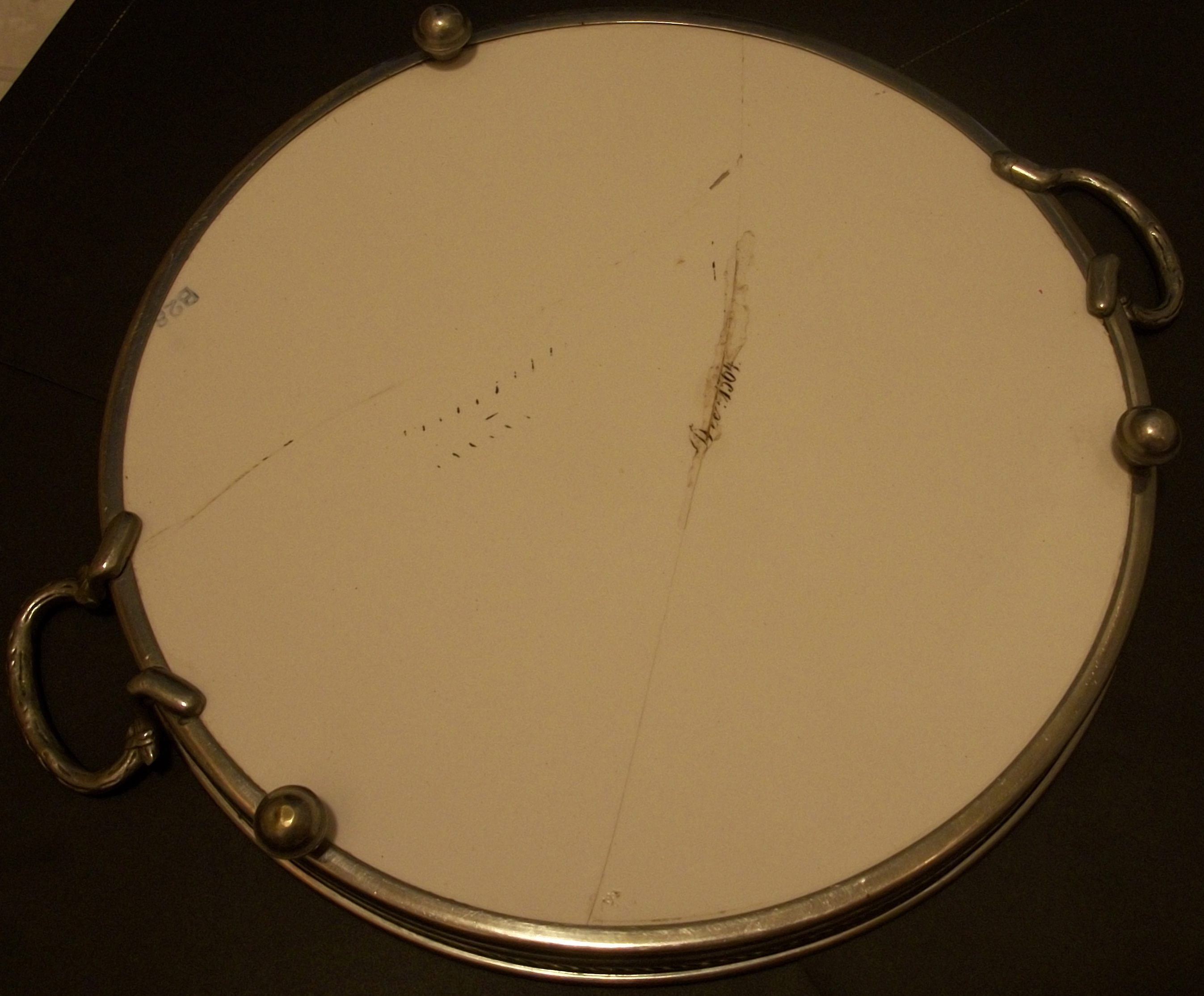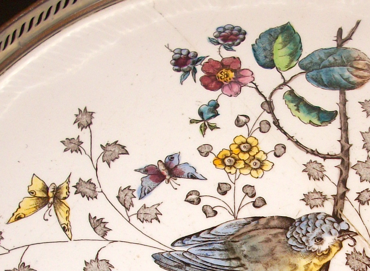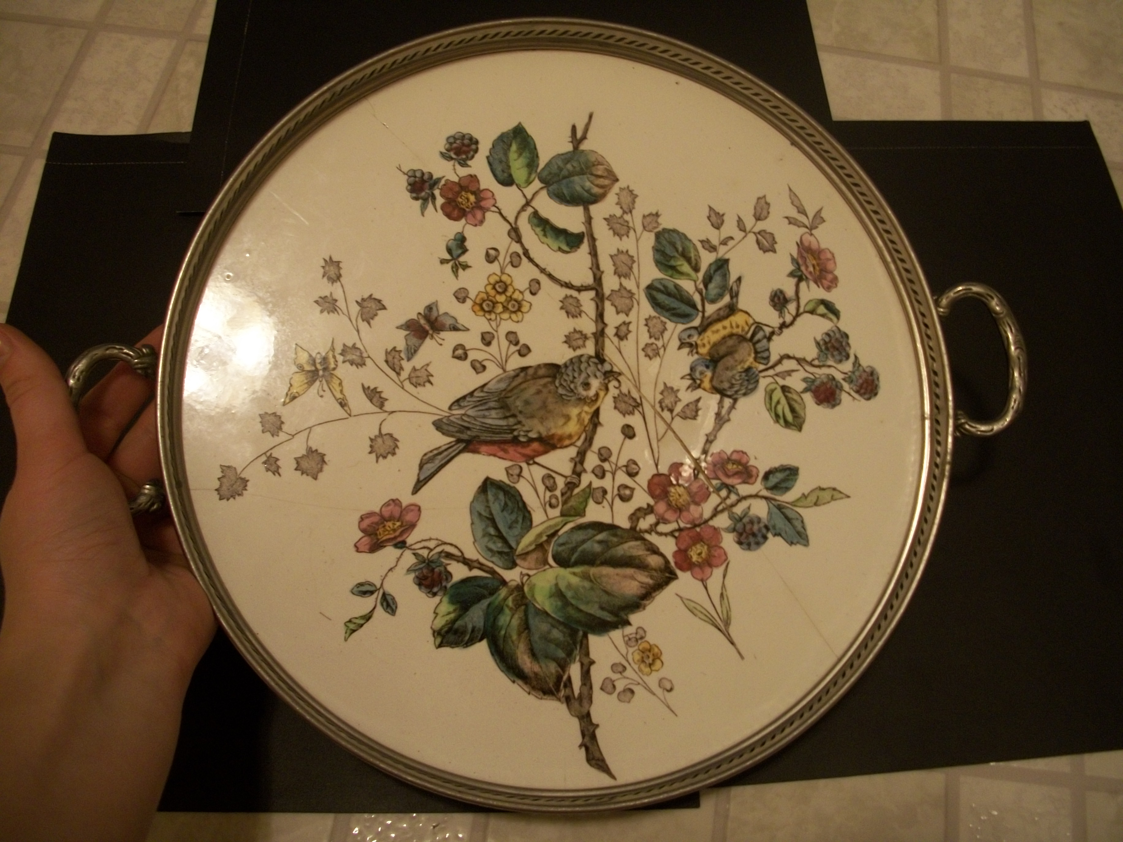 This is a round ceramic tray with what appears to be a raised silver border and handles, although I cannot find any indication as to whether it's silver. There are three round legs on the bottom of the tray. The handles and silver border are both detailed. The ceramic is a creamy color with a detailed painting of three birds, a butterfly and flowers. On the bottom of the tray there are several markings. One is a date of "Dec. 1564," another is an engraved "A," and a printed "B28," along with another engraved "G4."