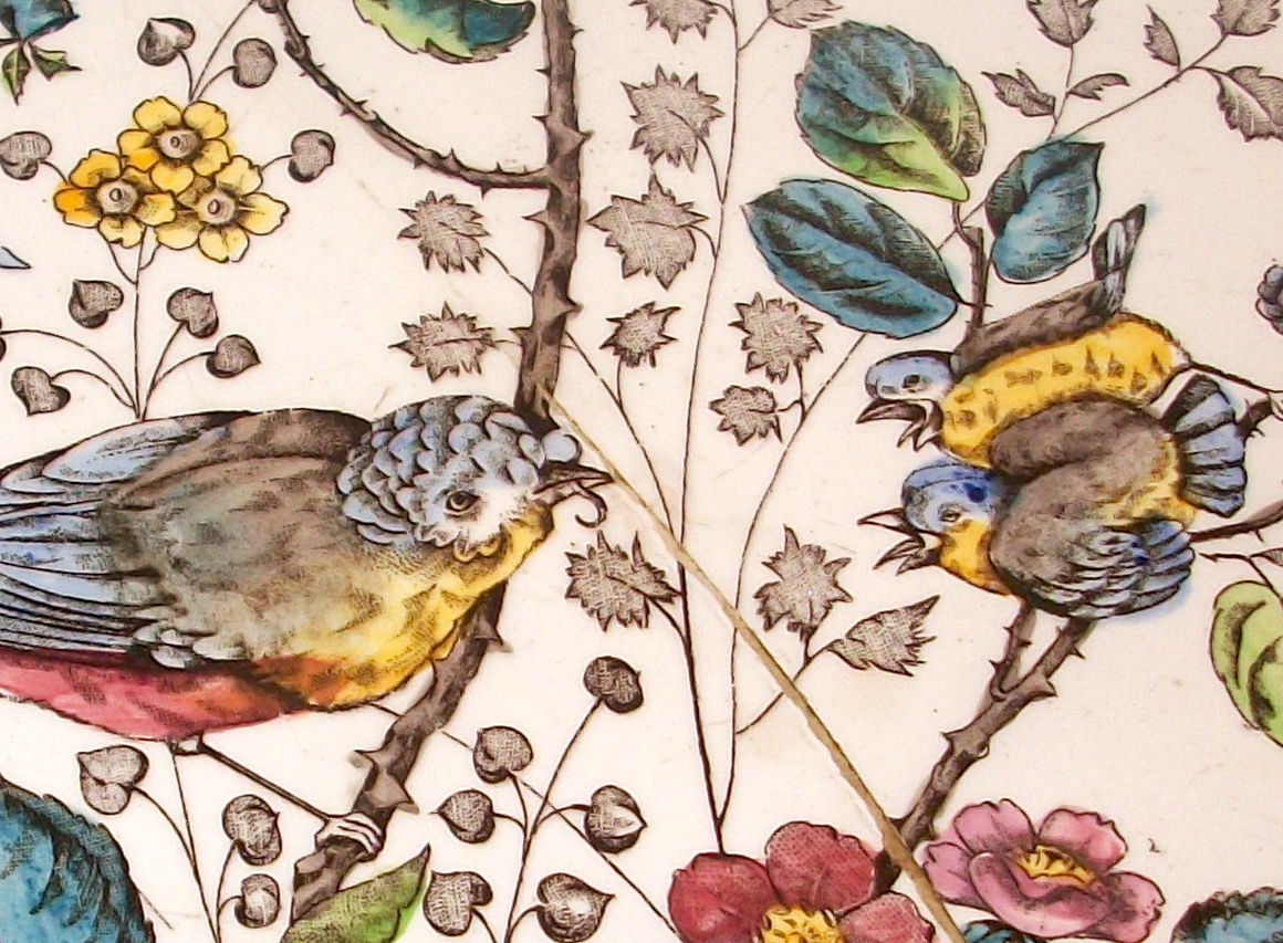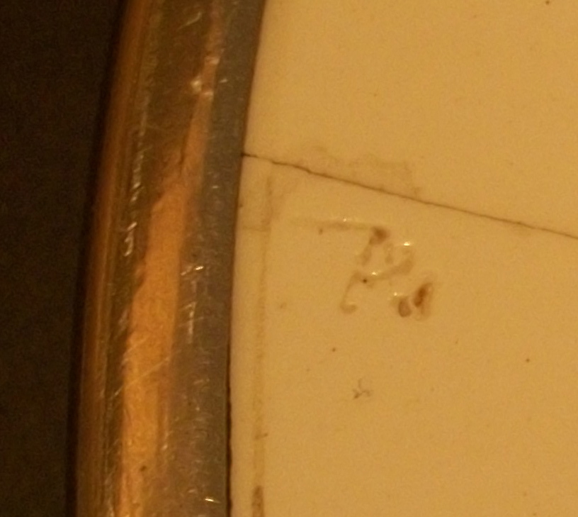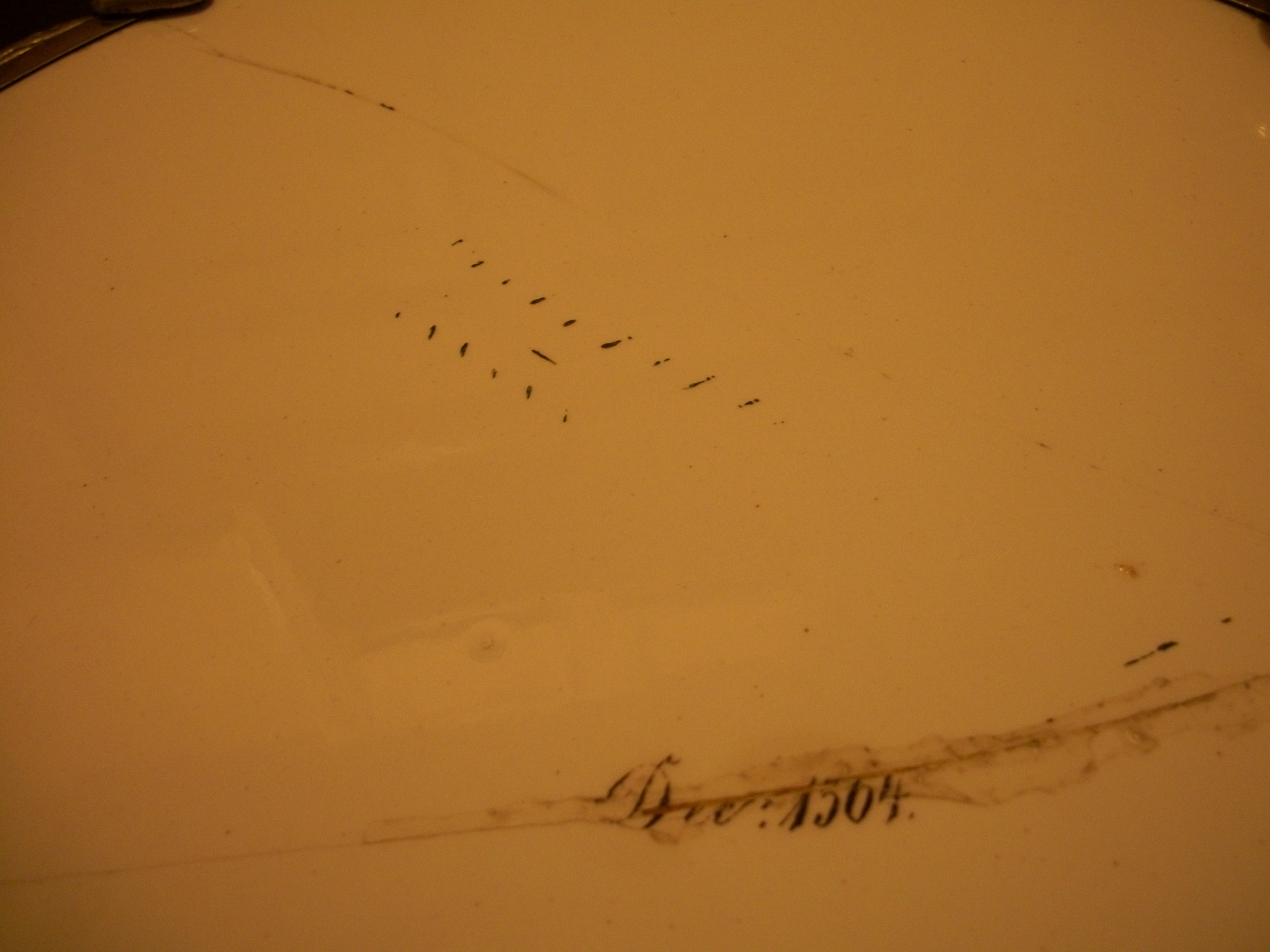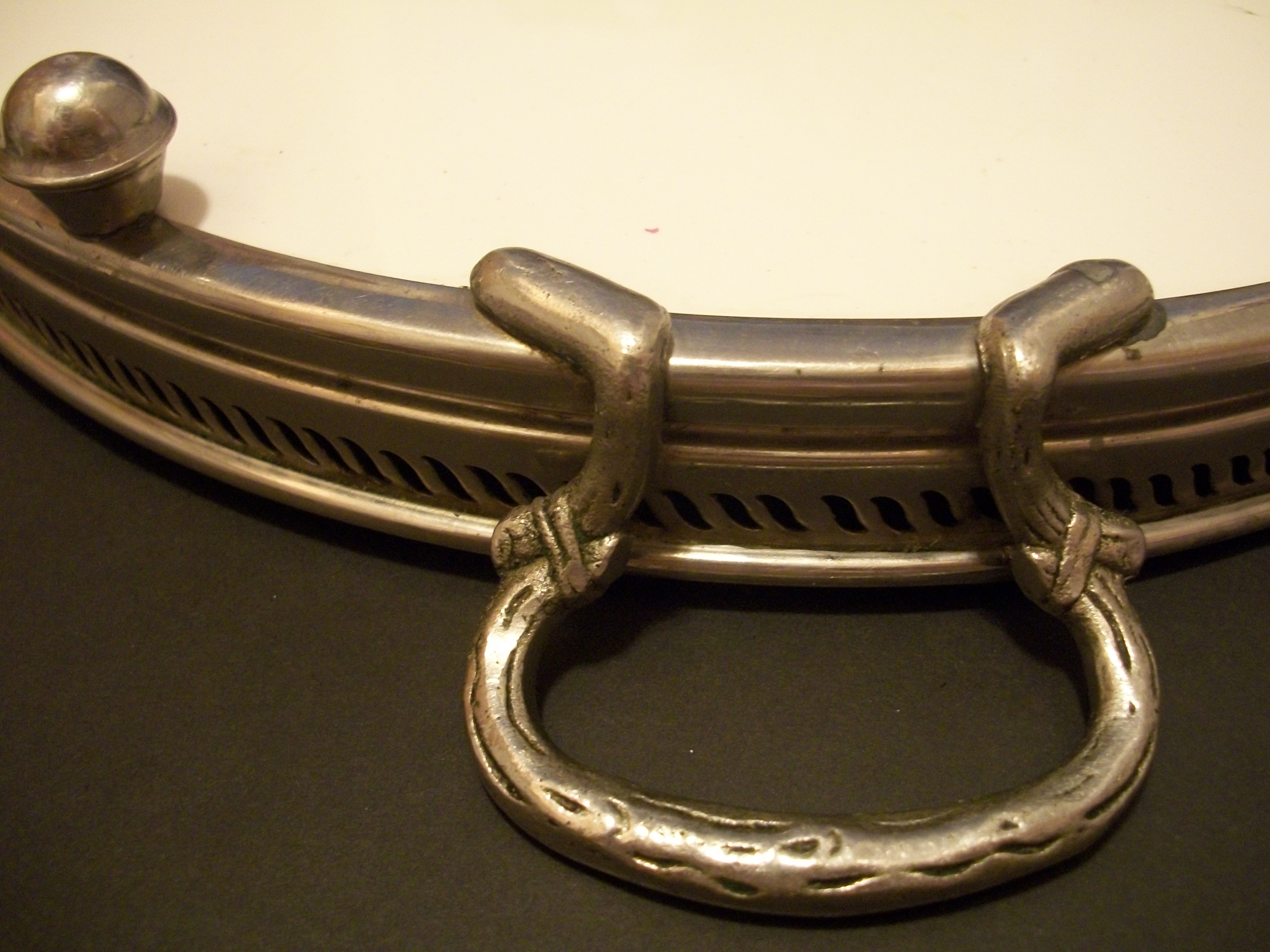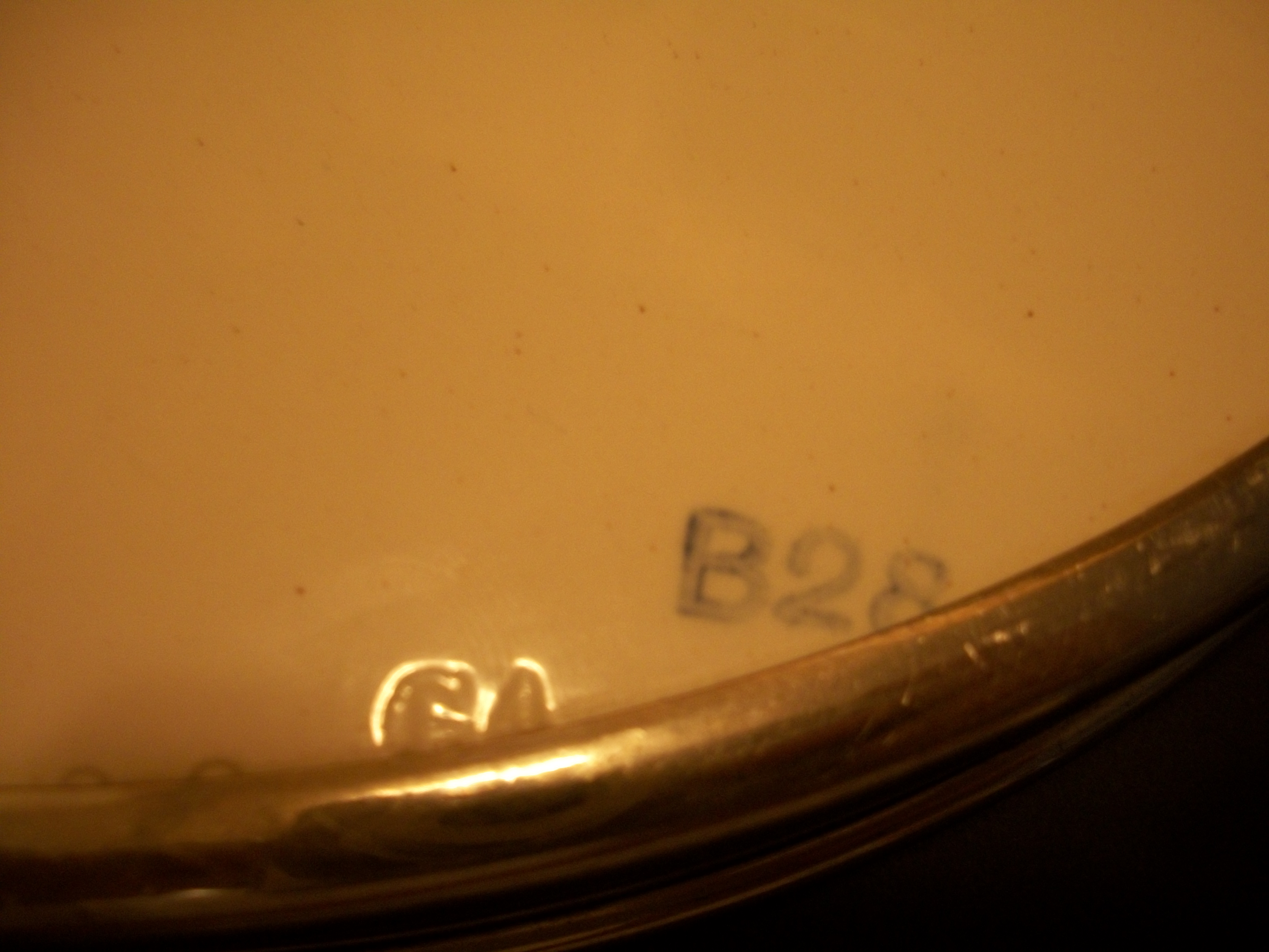 This is a round ceramic tray with what appears to be a raised silver border and handles, although I cannot find any indication as to whether it's silver. There are three round legs on the bottom of the tray. The handles and silver border are both detailed. The ceramic is a creamy color with a detailed painting of three birds, a butterfly and flowers. On the bottom of the tray there are several markings. One is a date of "Dec. 1564," another is an engraved "A," and a printed "B28," along with another engraved "G4."