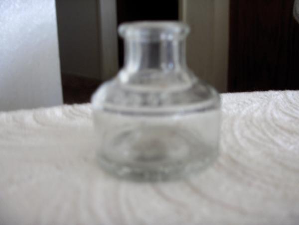 Round clear glass HIGGINS ink well, on the bottom of the bottle around the edge it says HIGGINS BROOKLYN. N.Y., and in the center of that it says 1. INKS 43, on the sloping edge of the bottle leading to the neck it says 3/4 oz., the bottom of the ink well is 1 1/2" in diameter, and is 2" high.