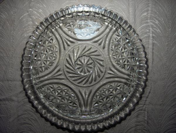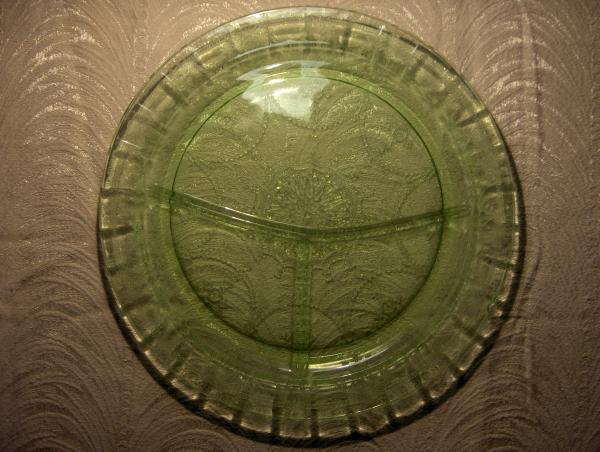 Round glass plate divided into three sections, A round clear glass serving plate with a design in the center as well as scallpoped edges , Round white saucer with scalloped edges that are slightly raised