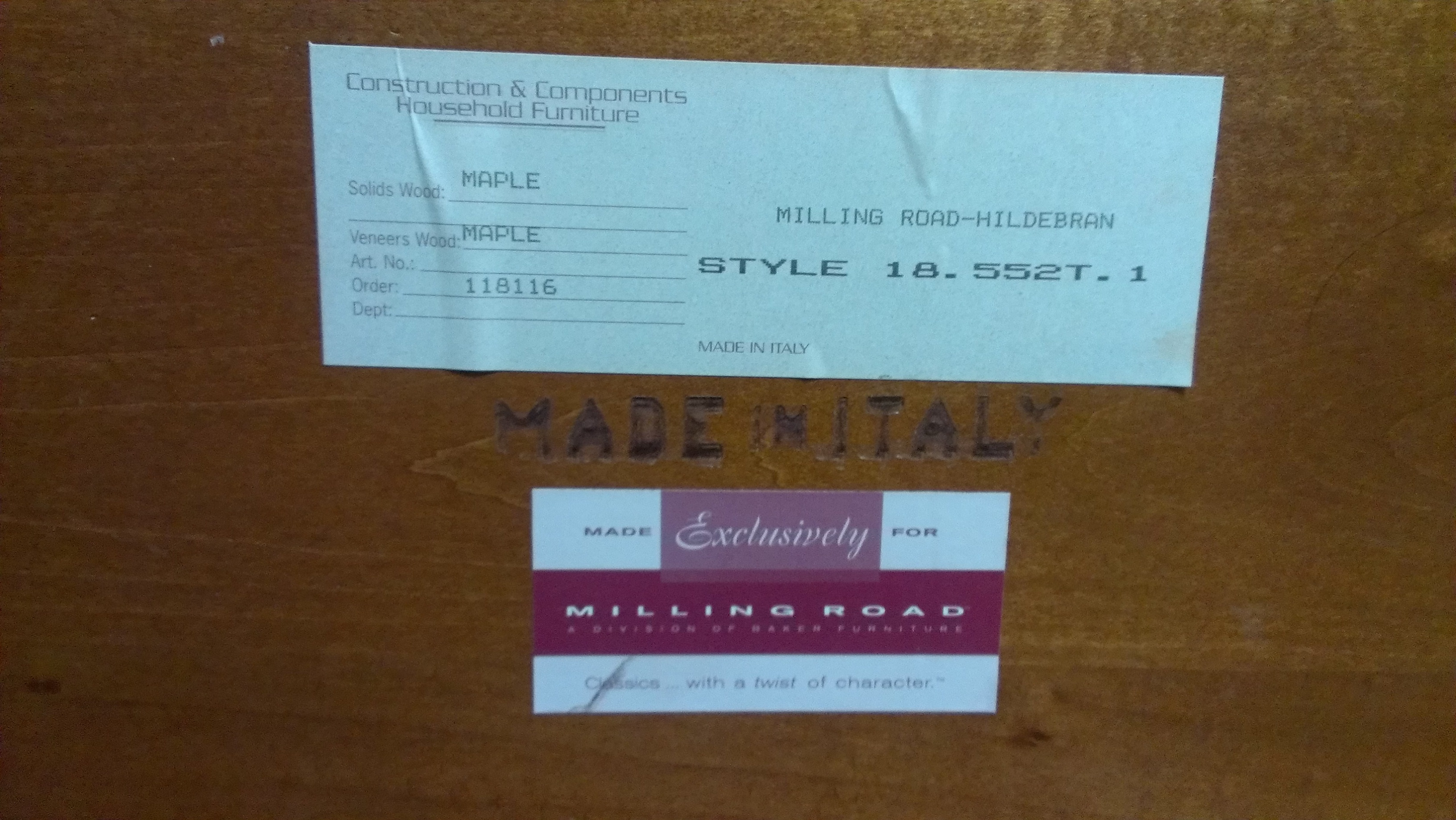 It is a round table with the original sticker on the back which I have attached a photo of, and is maple wood and is in good condition. Made in Italy