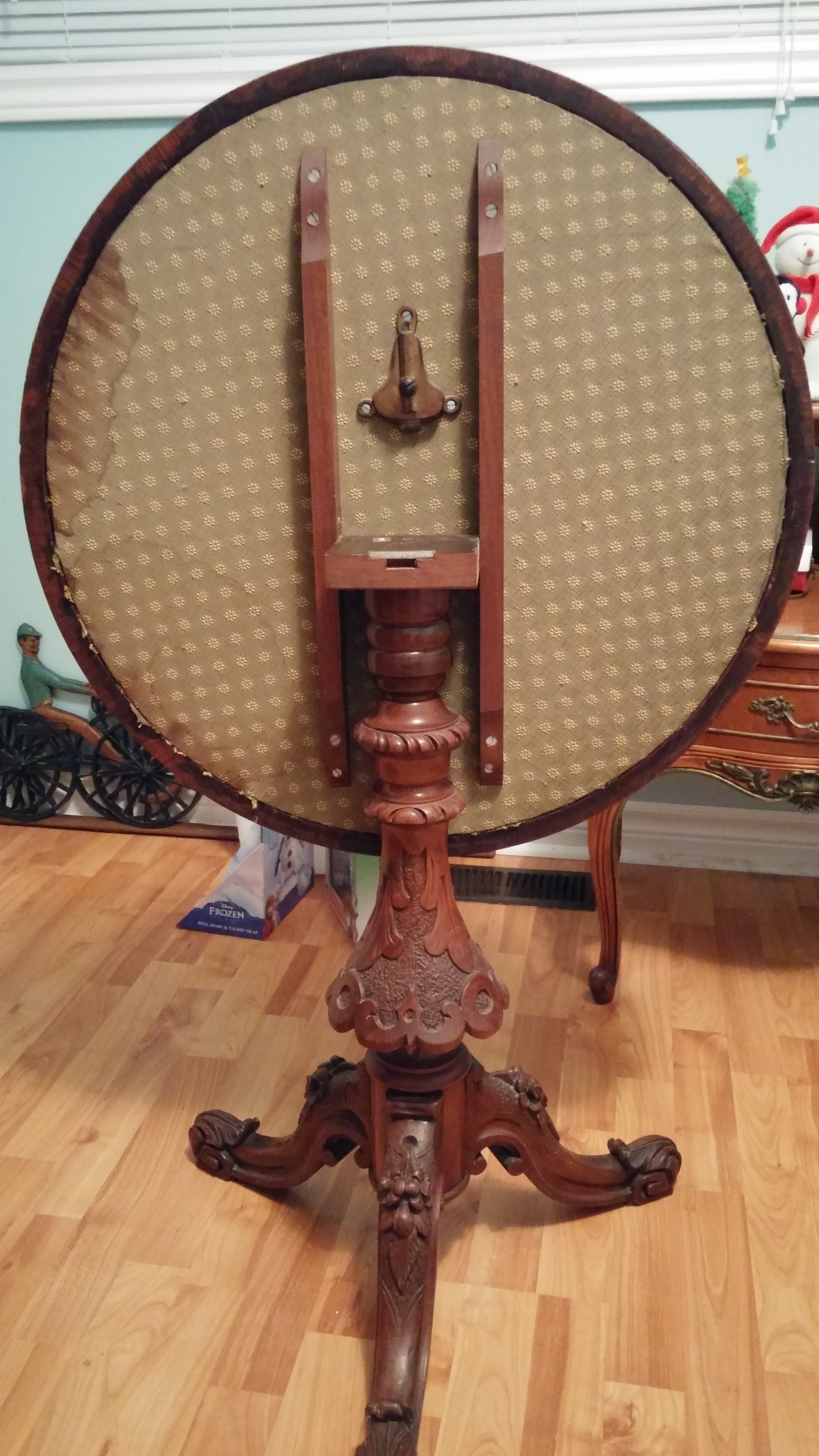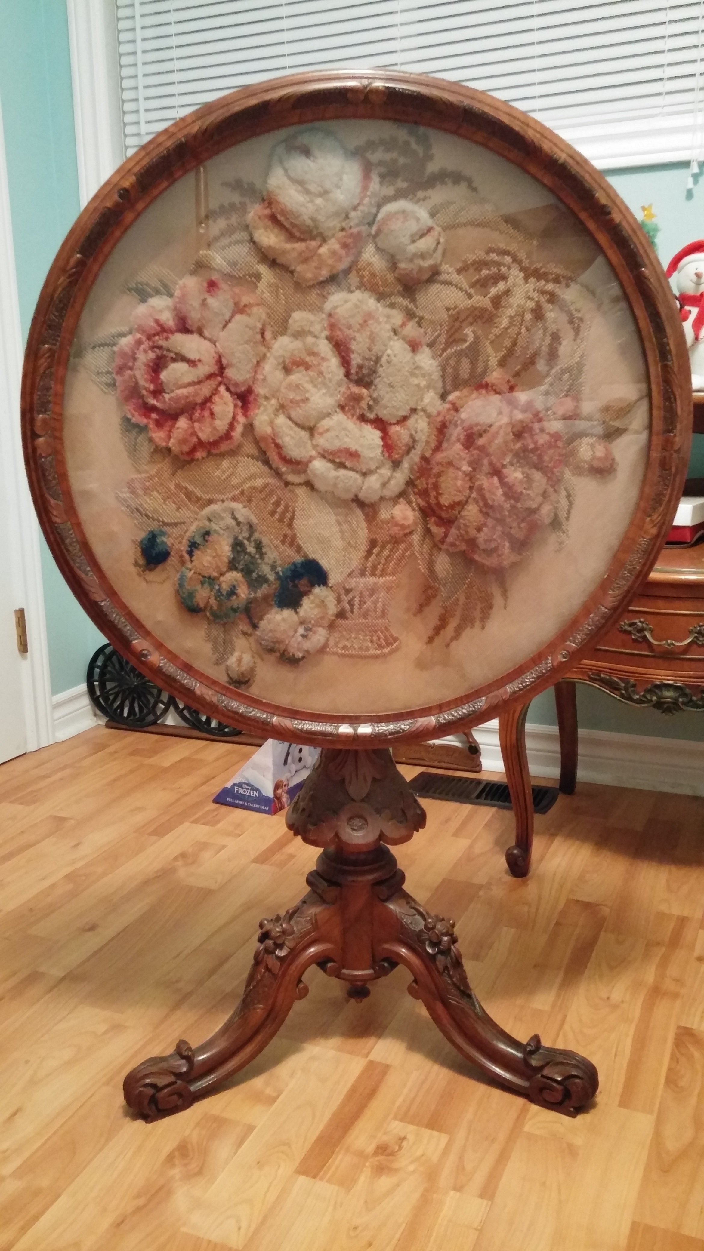 Re: round tilt top table with rug hooking under glass top