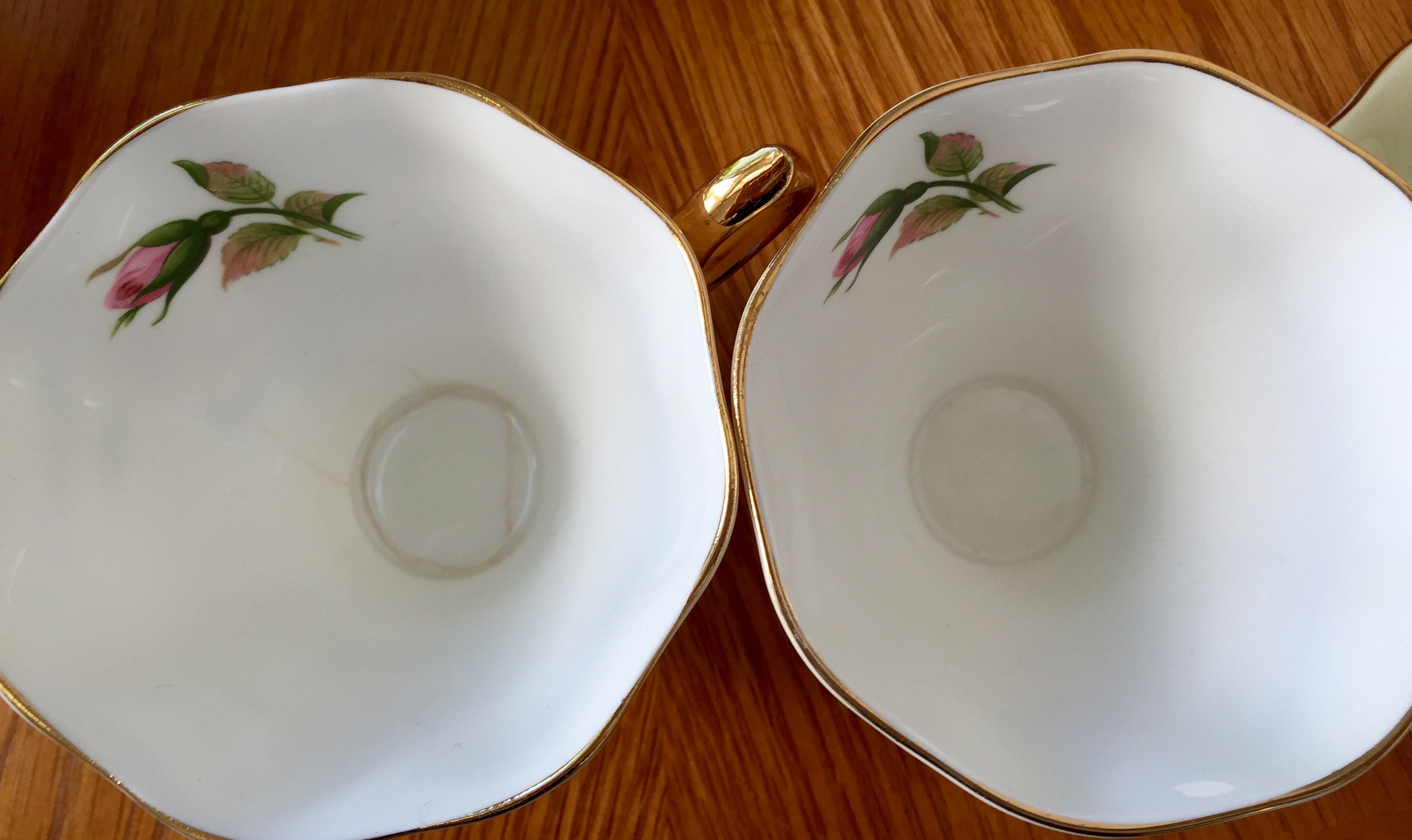 A few items have some flaws; two of the cups have some discoloration in the bottoms, the milk pitcher has some cracks in the glazing near the mouth, and a saucer has a white spot in between two roses along the outside.