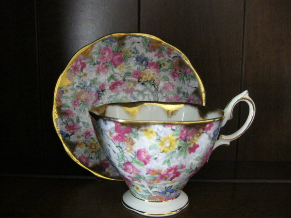 This tea cup and saucer is a Royal Albert with a Rose Chintz pattern trimmed with a gold scallop in a Malvern shape. I have researched this and can't find this pattern with a gold trim. Any information would be appreciated.