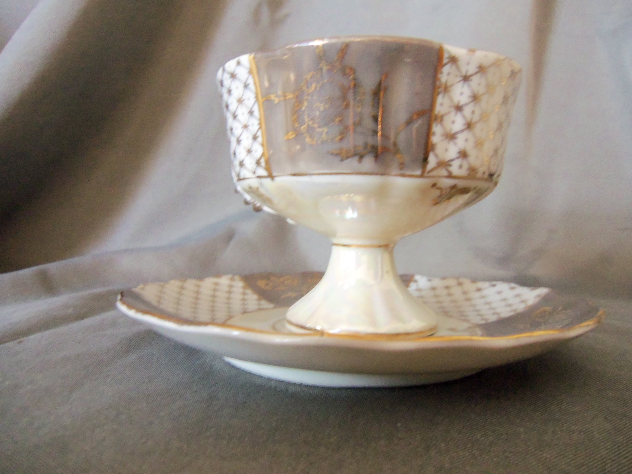 It is gray and white with gold flowers on the gray and gray starbursts on the white it is marked royal  crown /arnart 55/905 japan