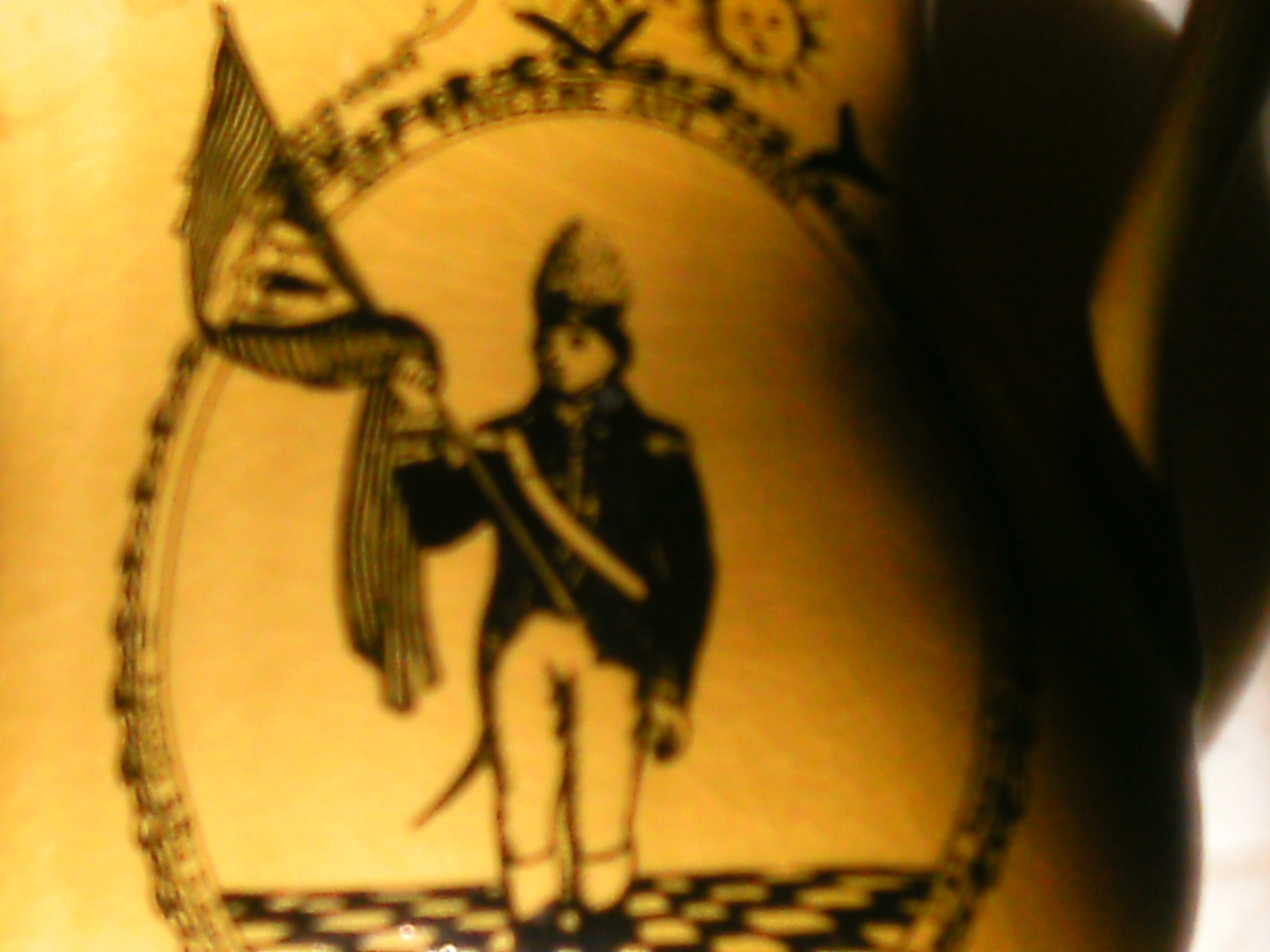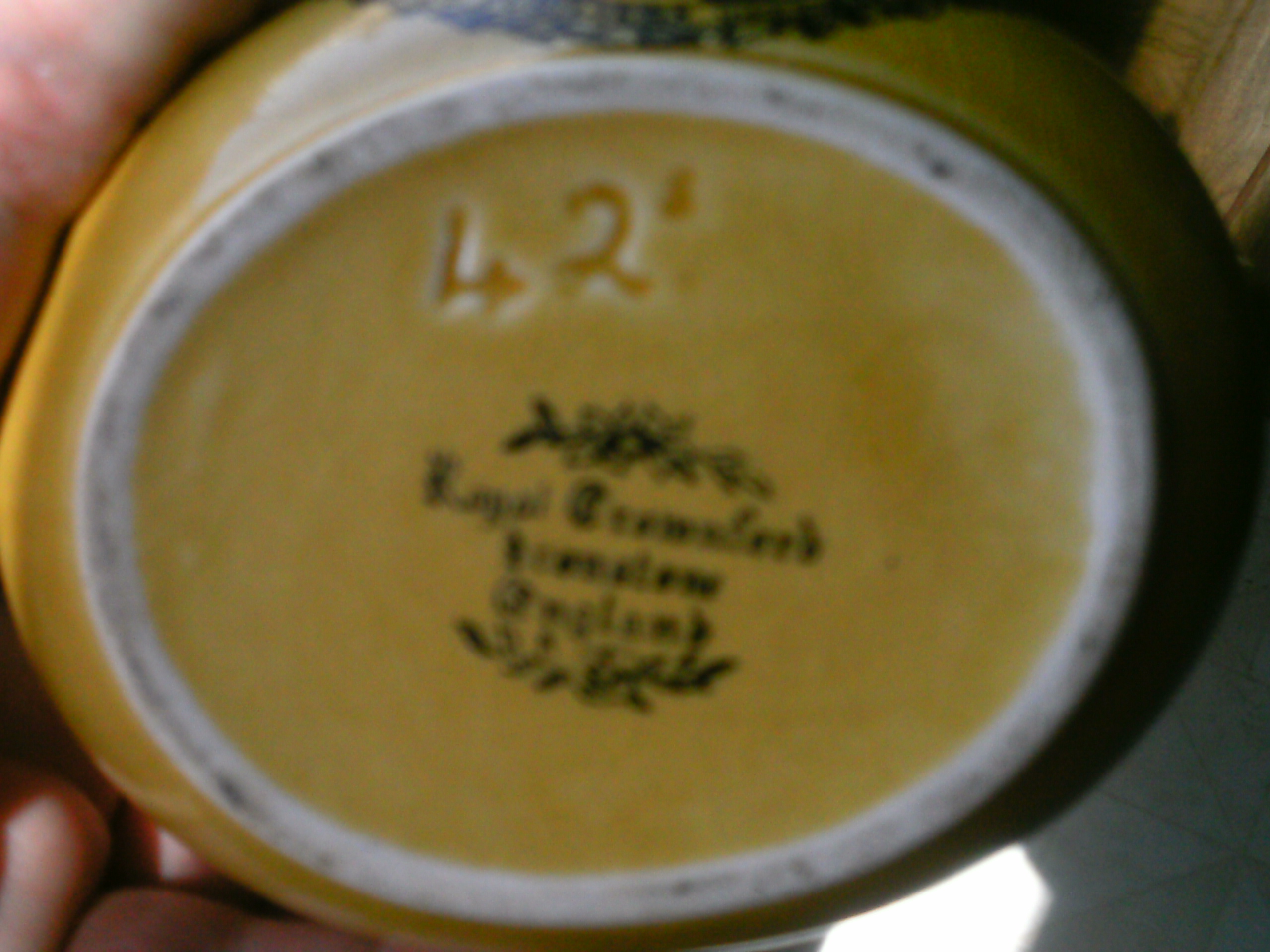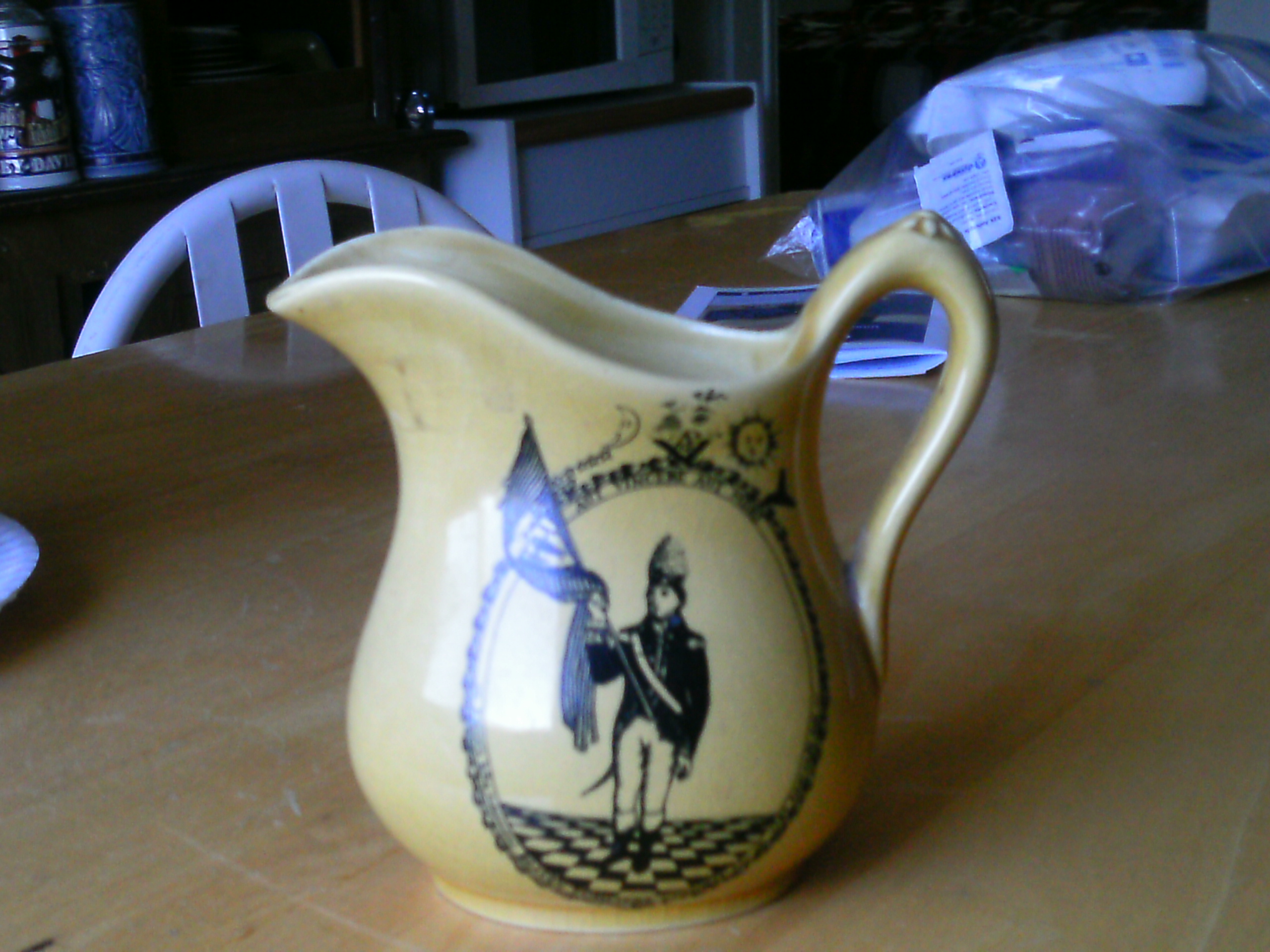 I HAVE A PALE YELLOW CREAMER OR SMALL PITCHER SAYS ROYAL CROWNFORD IRONSTONE ENGLAND WITH A #42 ON THE BOTTOM ON THE FRONT IS A PICTURE OF WHAT I BELIVE IS A BOSTON FUSLIER MILITAR FIGURE HOLDING A FLAG AND SAYS AUT VINCERE AUT MORI ALSO THERE ARE SMALL MASONIC SYMBOLS ABOVE THE FIGURE APROX 6 INCHES TALL