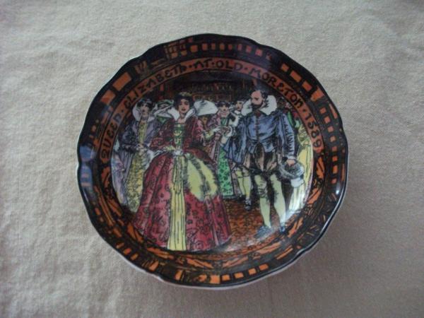 Orange and black background with Queen Elizabeth and Sir Walter Riley.The Queen in dressed in a yellow dress with a red gown over the top.Sir Walter has a light blue coat on with Yellow tights.It has 2 back stamps The old moreton stamp also athe lion crest with made in England Royal Doulton England .It also has a #16 on the back and a number D5490