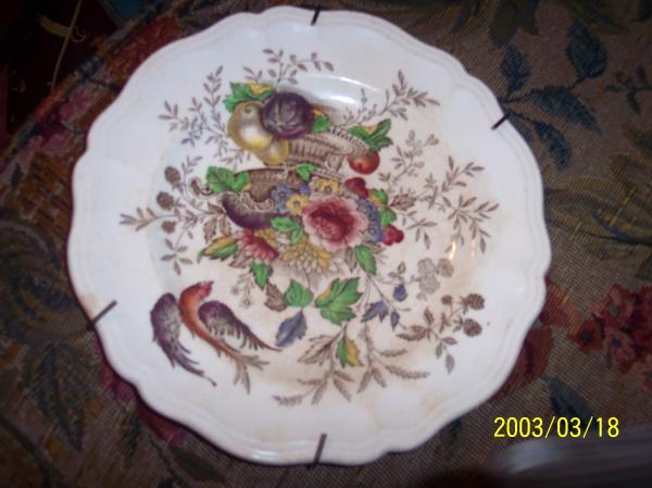 Two different plates. both with writing on back and paintings on front. first plate has birds and fruit also flowers. second plate has trees,oriental people, clouds, and a building structure.