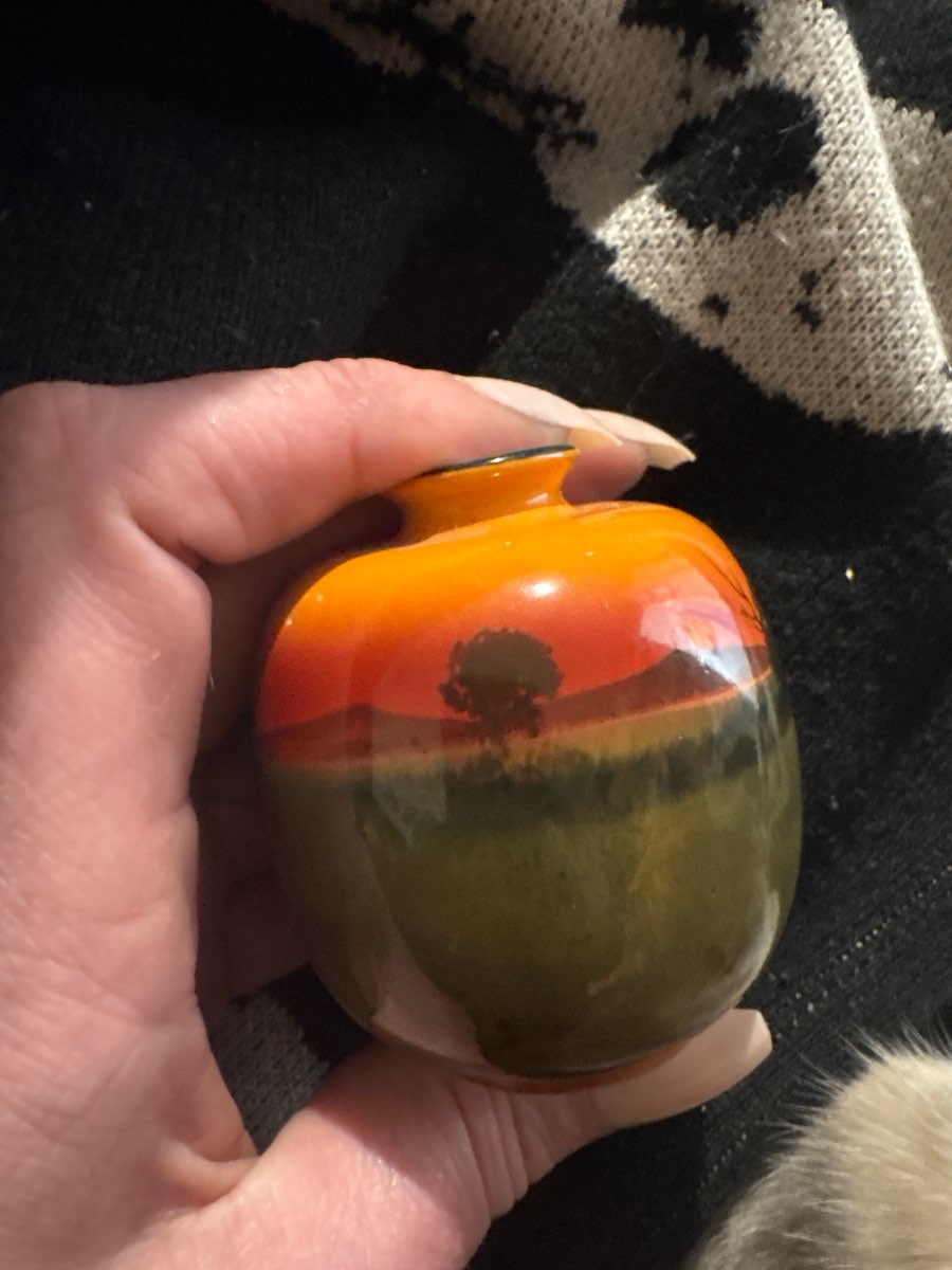 Physical Description: This charming miniature vase features a rounded body with a narrow neck, measuring approximately 3 inches in height and 2.5 inches in diameter. The vase is crafted from fine porcelain and showcases a hand-painted landscape scene depicting a church and trees against a sunset backdrop. The color palette includes warm oranges, greens, and browns, creating a striking visual appeal.