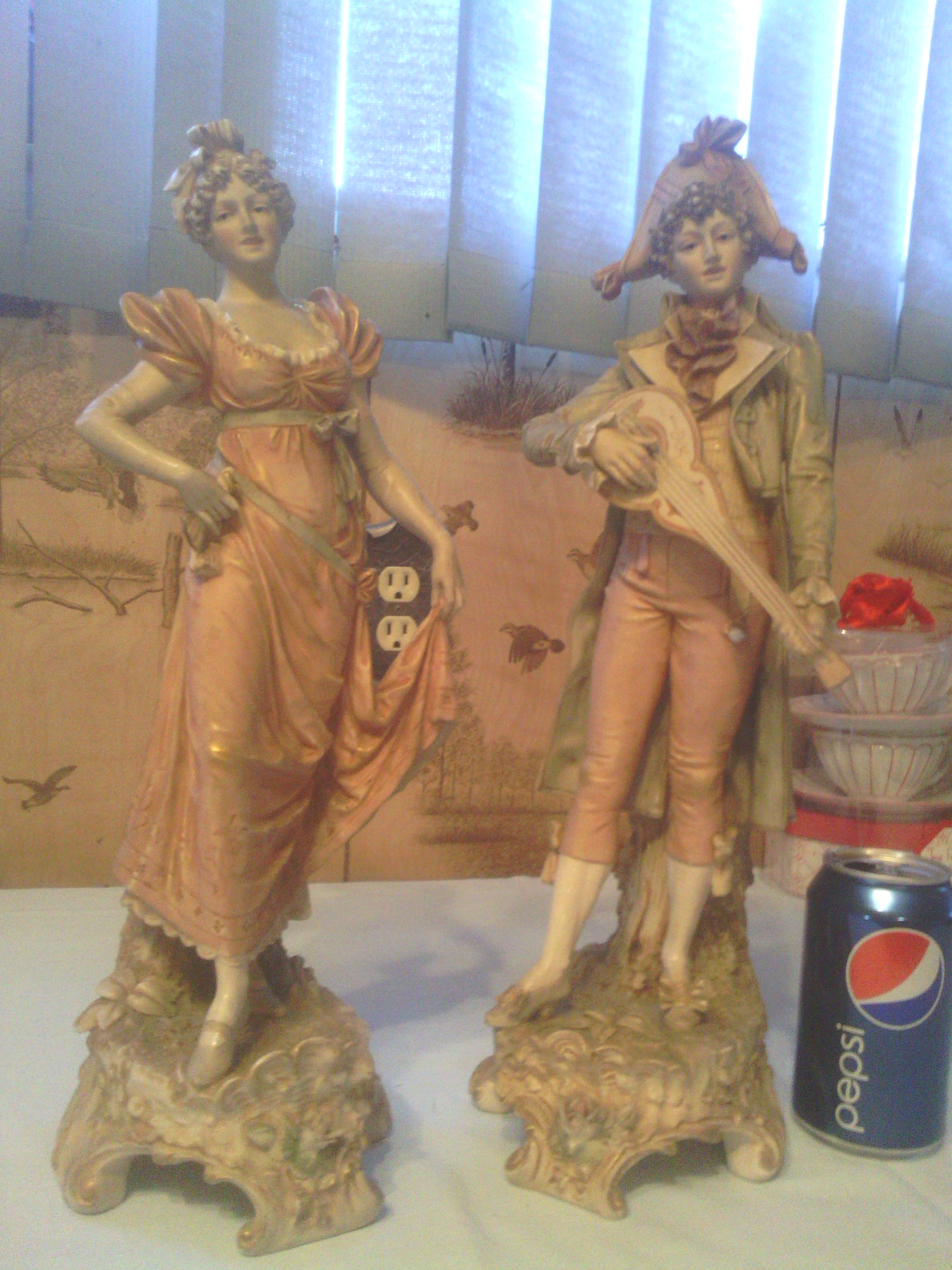 A pair #117 and 118 royal dux bohemia figurines. Female dancing and male playing a guitar type instrament. Both on a pedistal. She is in excellent condition. He has a bow off of his right boot right side barely noticable. I didnt until last night. Have been searching for them for a month now and can not find a thing online for this pair. Want to sell. A ballpark figure is good enough for me.