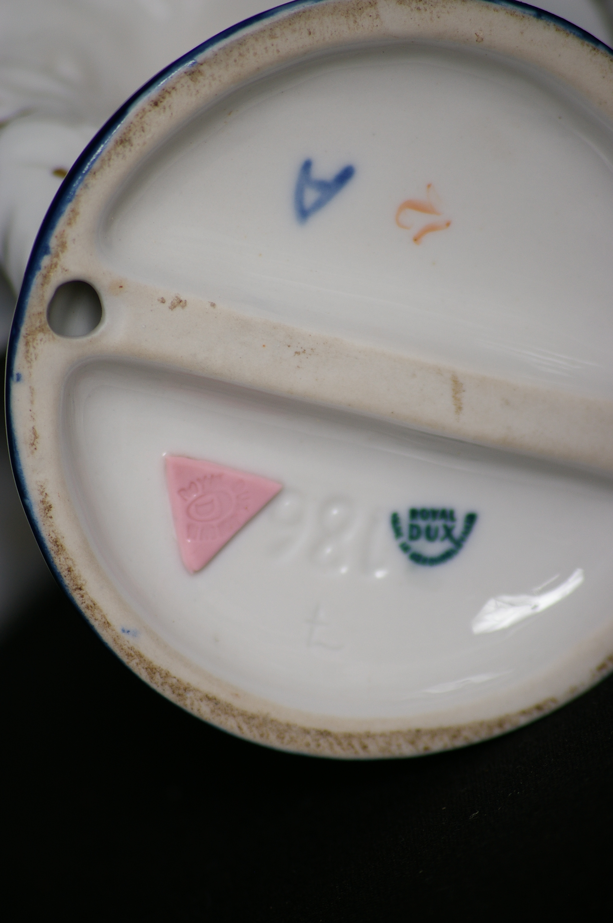 Royal Dux Figurine10" . Girl in navy blue dress with flower baskets . Pink triangle stamp on the base.